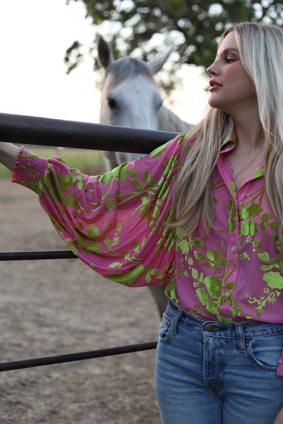 This blouse exudes elegance with its rich, textured fabric and sleek pink and green design. The relaxed fit and voluminous sleeves give it a stylish yet comfortable silhouette, making it perfect for both casual and dressy occasions. The subtle sheen of the fabric adds a touch of sophistication, while the button-down design provides versatility, allowing you to easily dress it up or down. Pair it with distressed jeans for a chic, laid-back look, or wear it with tailored pants for a more polished ensemble