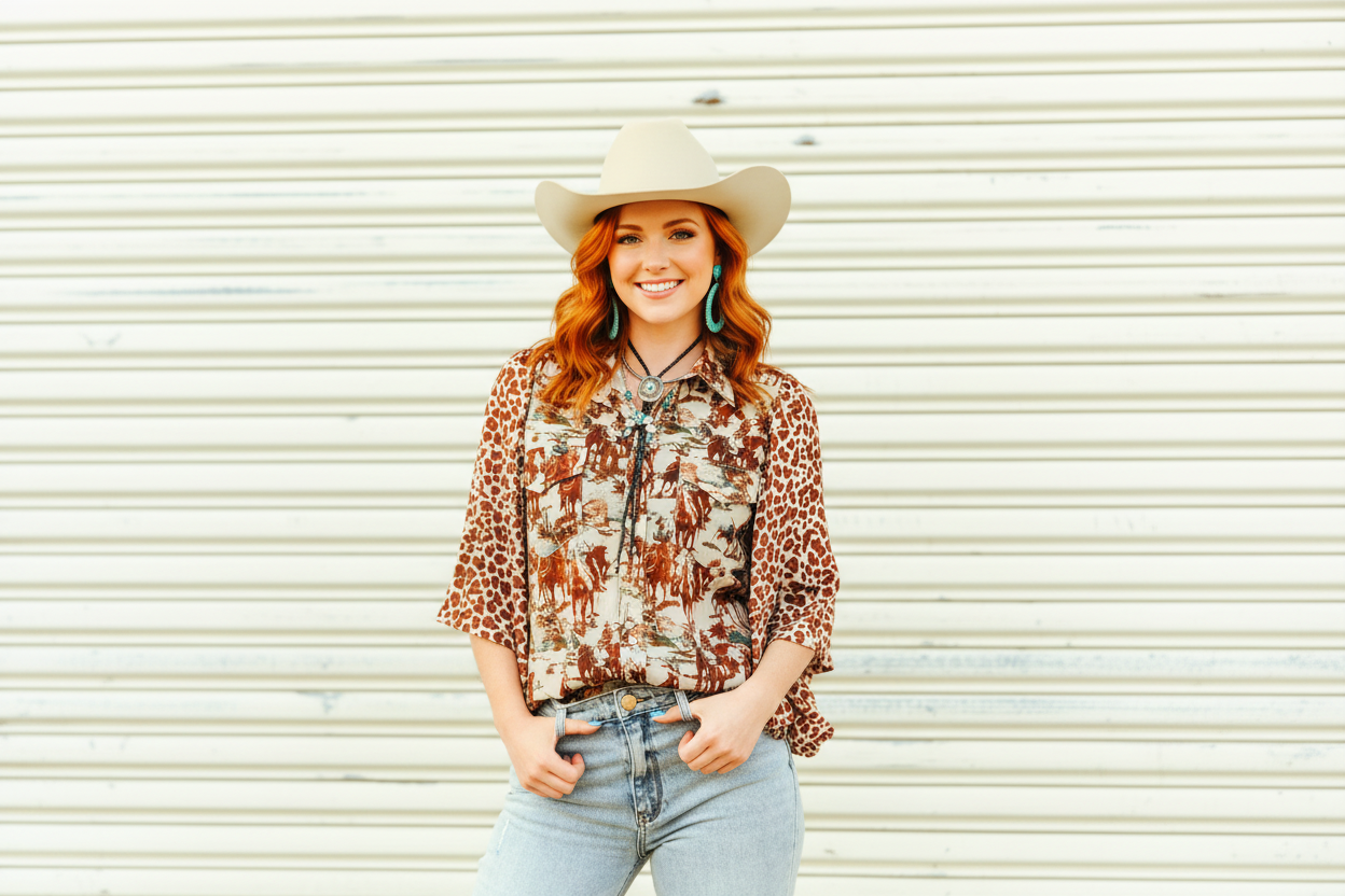 Print: Mixed – Cowboy scene front and cheetah print sleeves/back