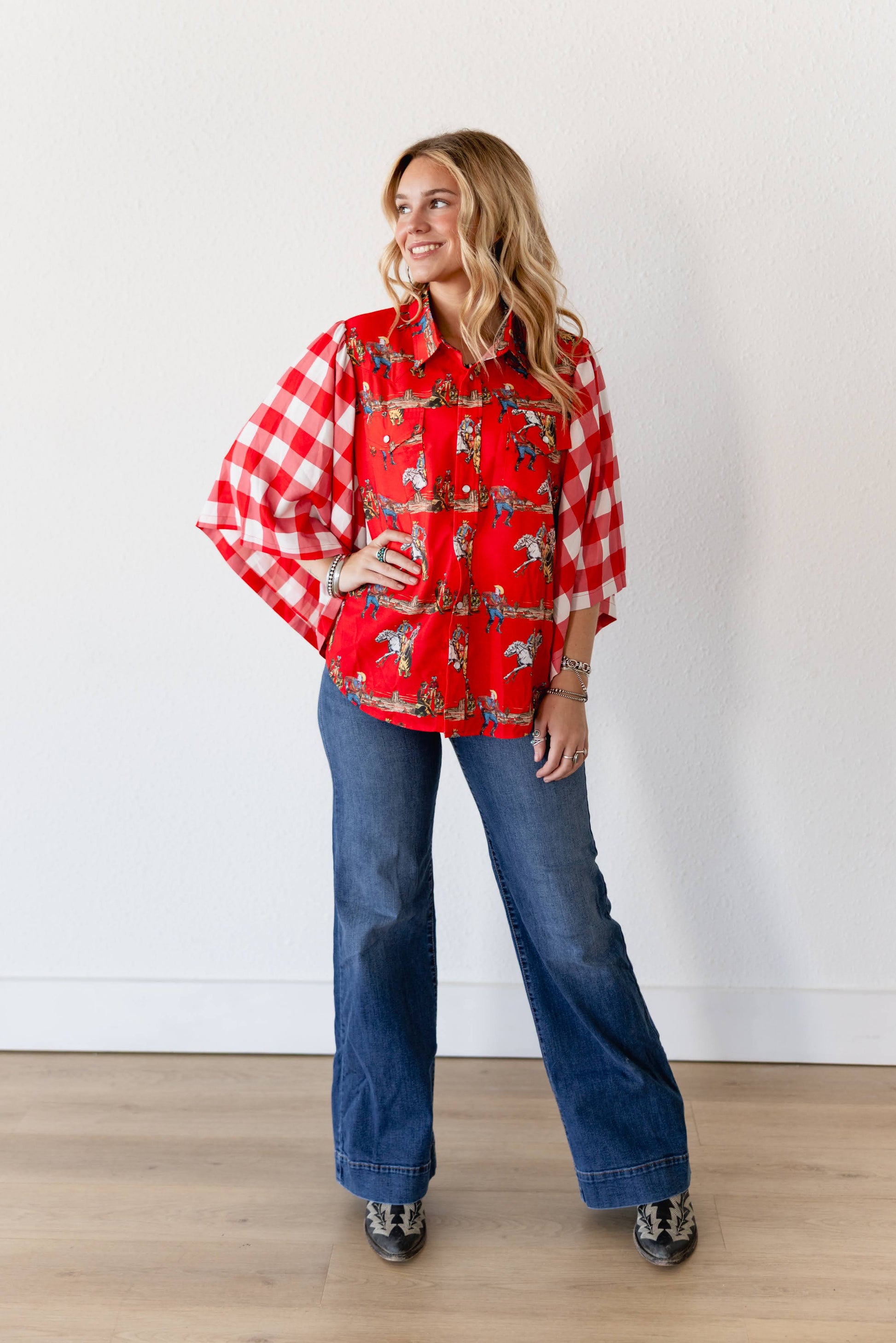 The Rodeo Revival Button-Up brings bold western character with a mix of vibrant prints. The body features an allover vintage rodeo scene in vivid multicolor on a bright red base, depicting cowboys, horses, and rustic fencing. The contrast sleeves are crafted in a red and white buffalo check pattern, cut wide for a relaxed, flowing fit. Details include pearl snap buttons, dual front flap pockets, and a classic pointed collar, combining western tradition with modern flair.