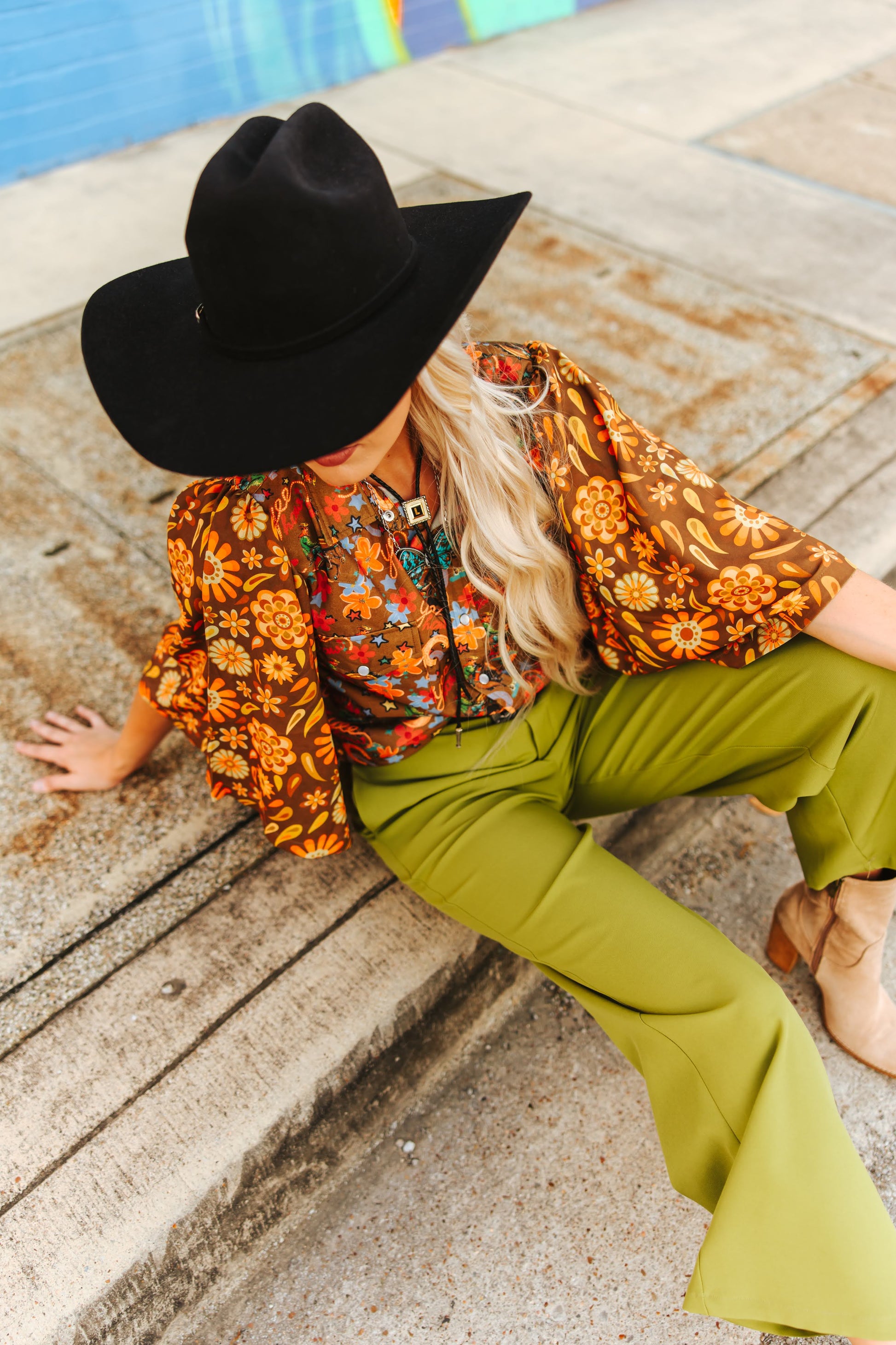 Turn heads with this bold western-inspired beauty. Featuring a classic pearl snap vintage body splashed with colorful retro motifs, this top gets a wild upgrade with funky, floral-print sleeves that bring all the groovy ‘70s vibes. Pair it with denim, trousers, or skirts for a statement look that’s equal parts cowgirl cool and free-spirited funky.