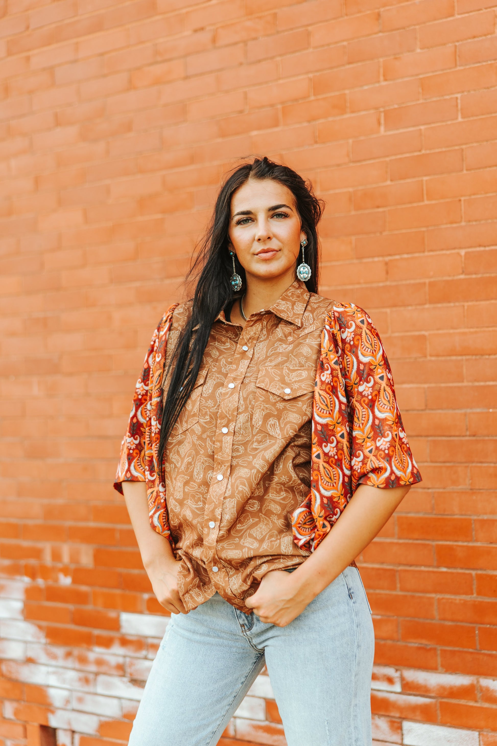 This western-inspired blouse features a mixed-pattern design with a brown button-down front and abstract cowboy-themed motifs, paired with wide, flowy sleeves in a contrasting vibrant red-orange paisley print. The structured collar and chest flap pockets give it a classic western shirt silhouette, while the oversized batwing-style sleeves add a modern boho touch—ideal for boutiques offering eclectic or western-fusion apparel.