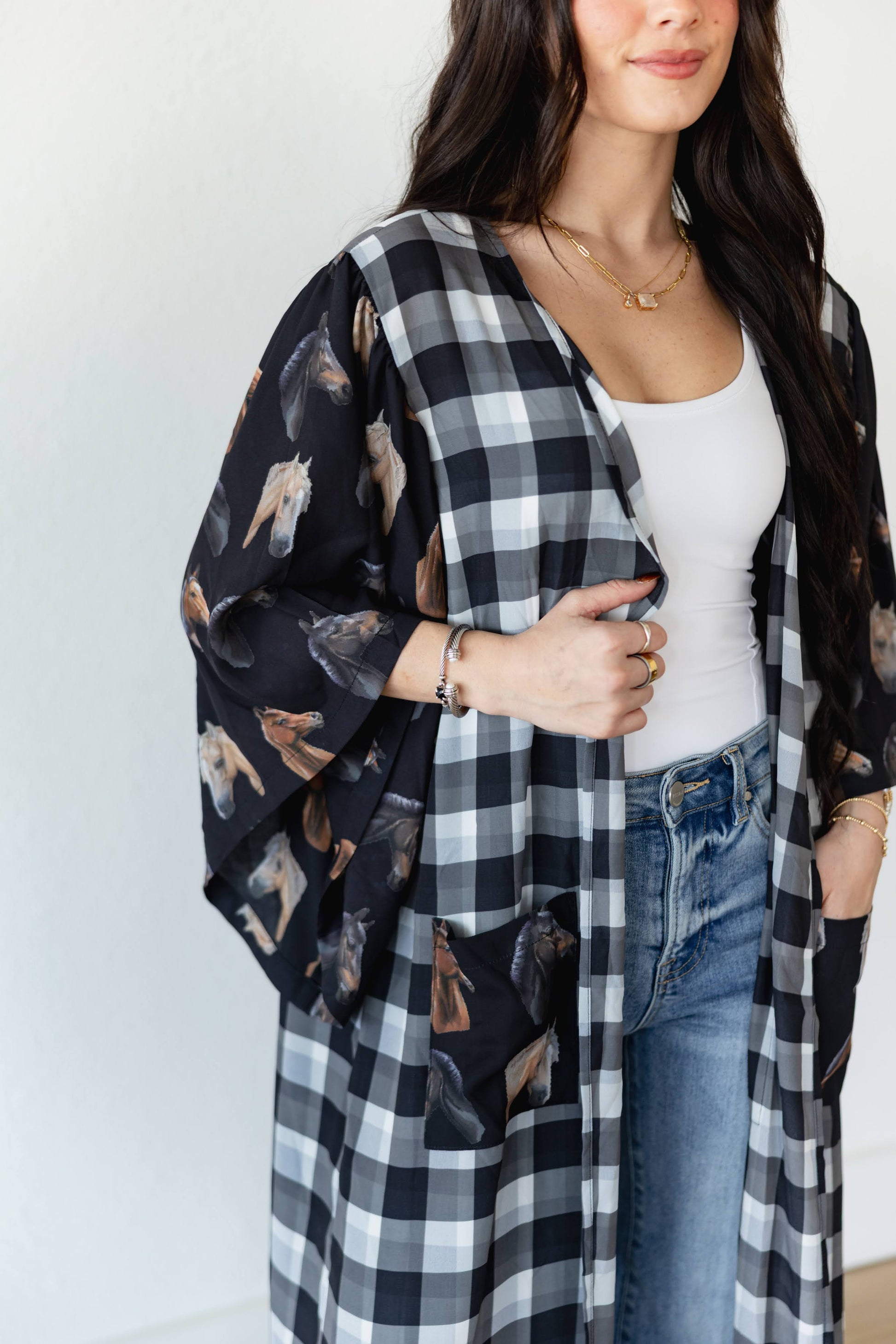 PREPACK 2S-2M-2L-1XLThe Western Gingham Horse Print Kimono blends classic country charm with modern boho flair. This long, duster-length kimono features a unique combination of black-and-white gingham and photographic horse graphics throughout the sleeves and back. Lightweight with an open front and relaxed fit, it’s designed to layer effortlessly over denim and basics.