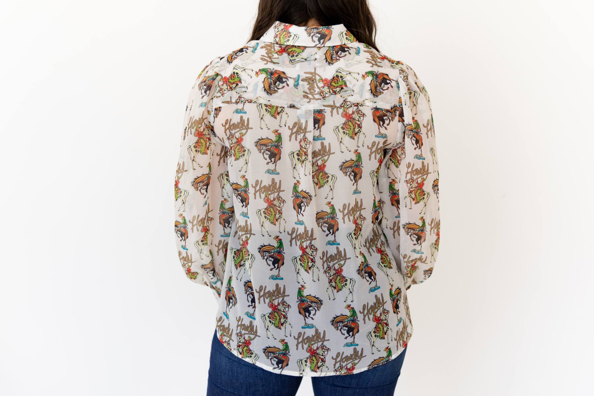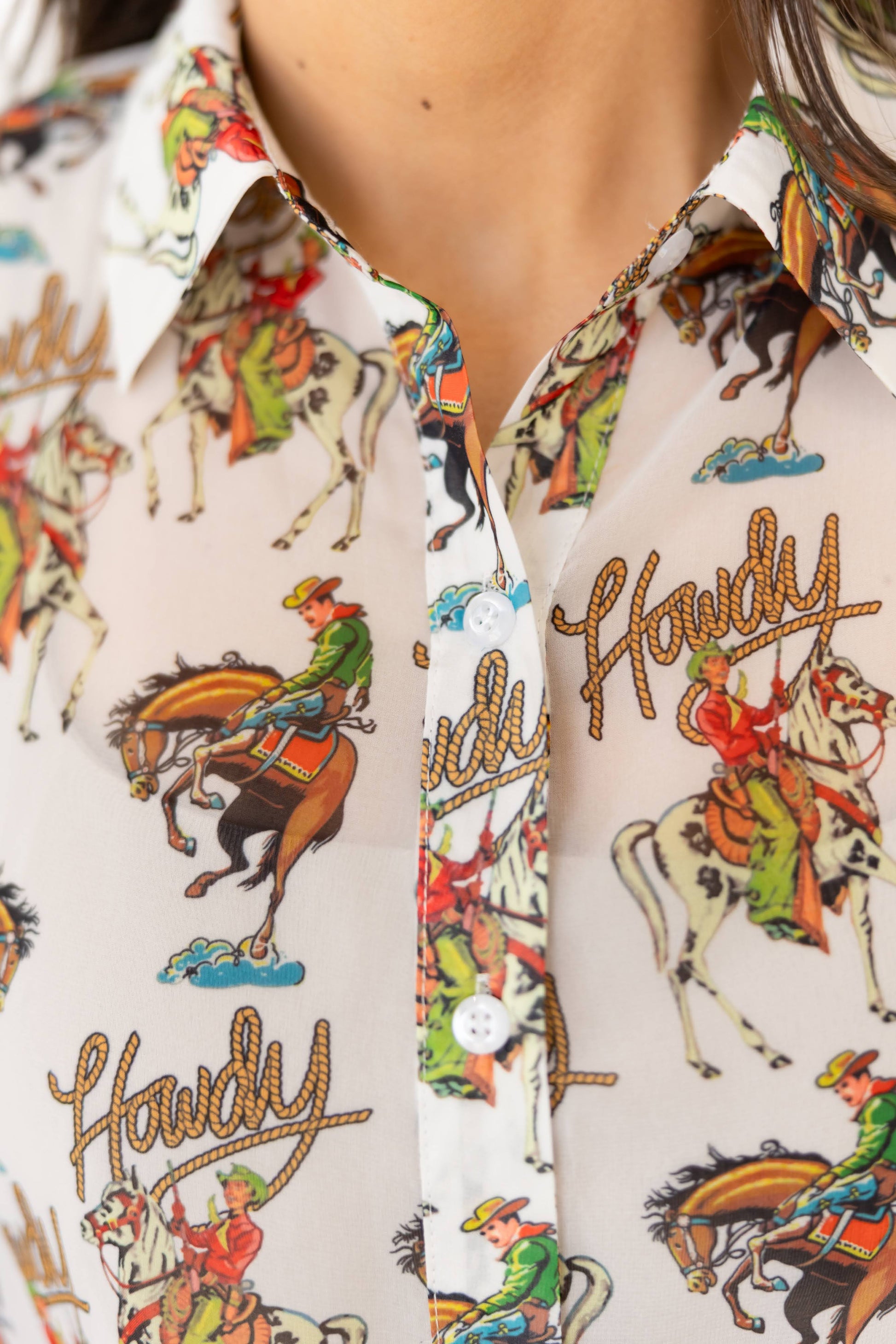 This lightweight ivory blouse features a playful allover print of rodeo cowgirls and “Howdy” script, making it a fun and standout piece for western-inspired collections. Its semi-sheer fabric and relaxed silhouette lend it versatility for both casual and boutique styling.