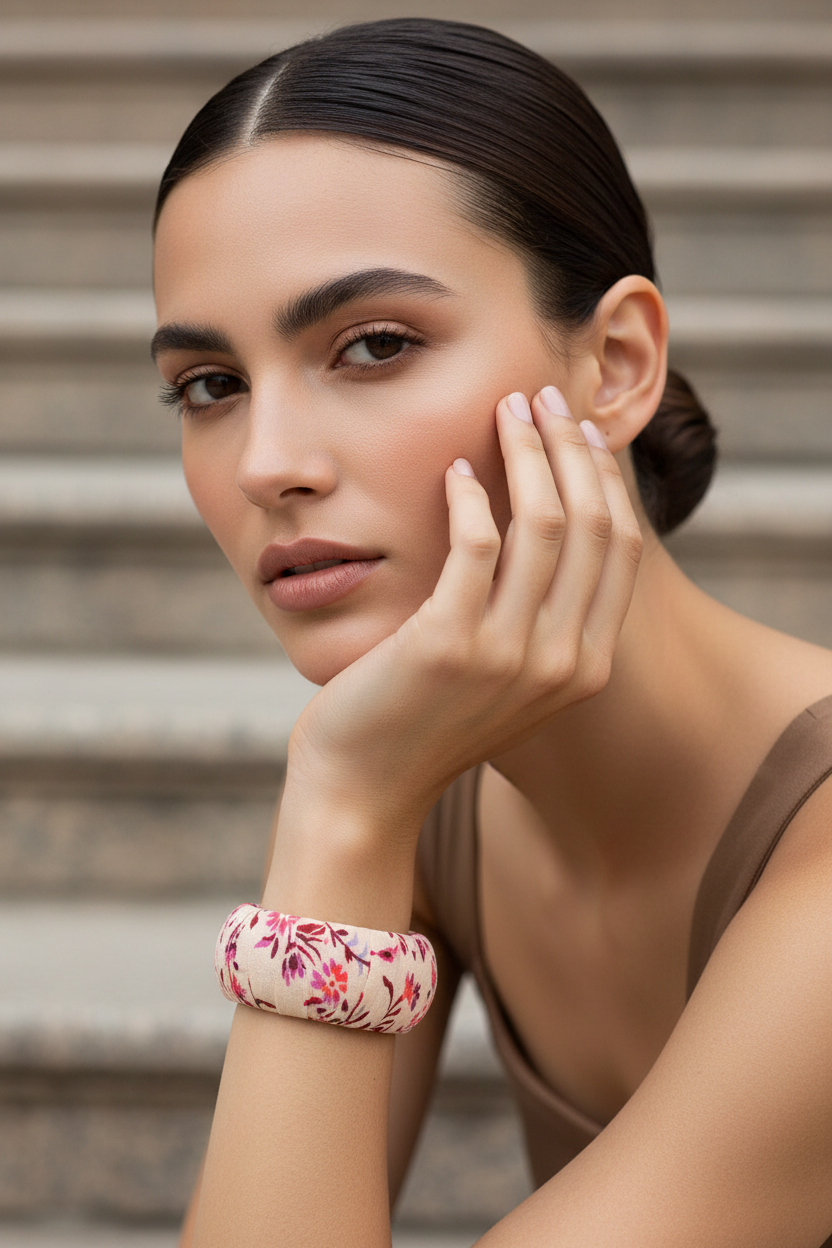 This jewelry collection includes a fabric-wrapped necklace, earrings, and bangles, all handcrafted with a consistent floral textile for a cohesive, artisan look. Each piece features a lightweight yet structured form, wrapped in cotton-blend fabric with delicate floral patterns. The set is designed to offer a comfortable fit with a distinct handcrafted appeal, ideal for boutiques seeking bohemian or ethnic-inspired accessories.