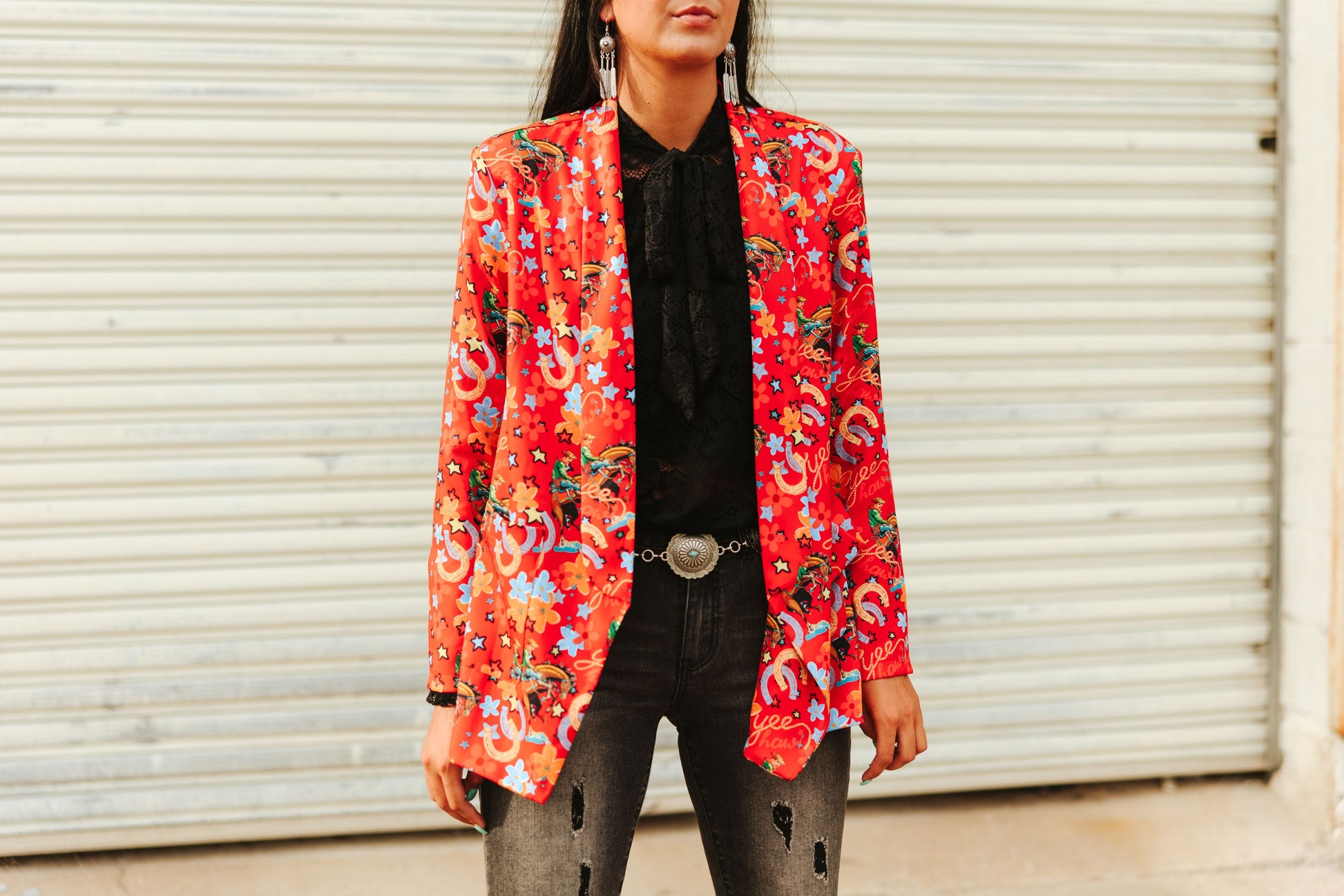 Color: Bold red base with all-over multicolor Western print