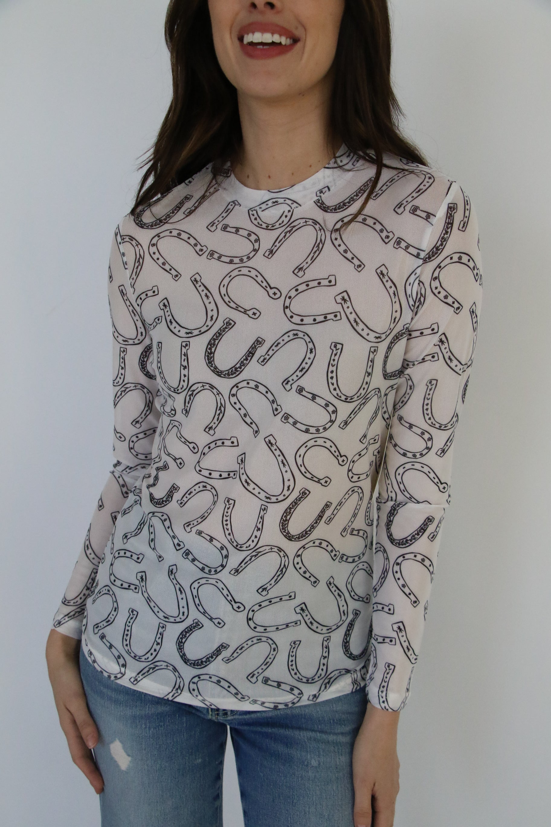 This long-sleeve mesh top is giving major western-chic vibes! Featuring an allover black horseshoe print on a sheer, stretchy fabric, it's the perfect lightweight layering piece to add a little luck (and a lot of style) to your outfit. Wear it under a graphic tee or rock it solo for a bold statement—either way, you're guaranteed to turn heads.