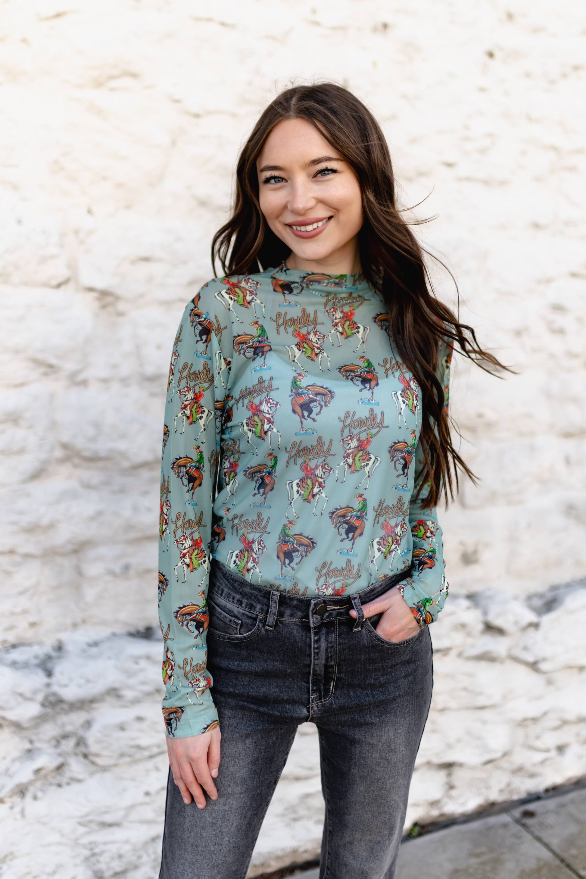 This Western-themed mesh top features an allover vintage-style cowboy print with riders on horseback and repeating “Howdy” script across a muted teal background. Made from sheer stretch mesh, it’s a standout layering piece with a playful retro vibe.