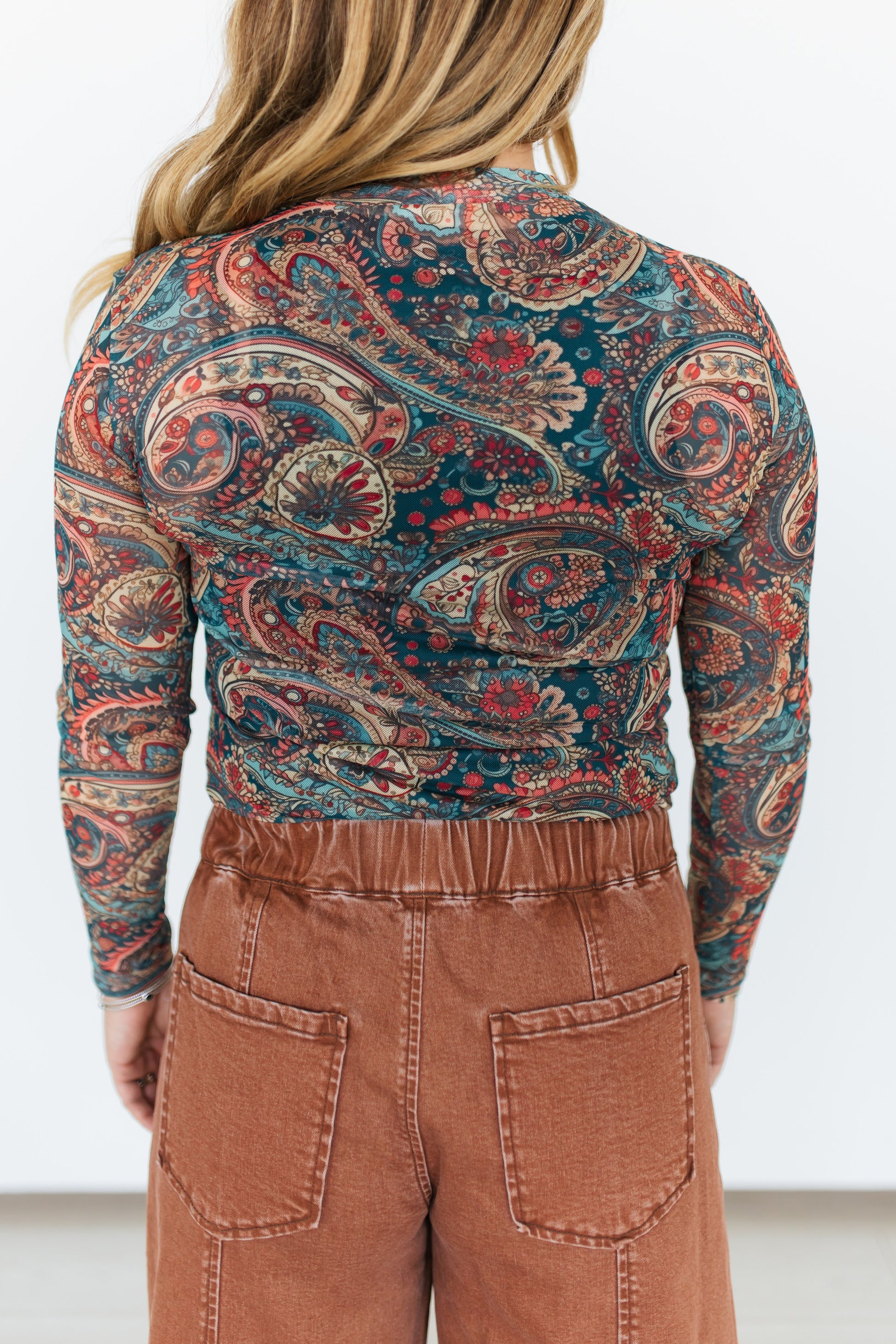 Lightweight long-sleeve mesh top featuring an all-over paisley print in shades of teal, coral, tan, and ivory. The intricate design includes floral accents woven into the paisley motifs for a detailed, bohemian-inspired look. Crafted from semi-sheer stretch mesh with a crew neckline and straight hem, this top works as a statement piece or layered under jackets and vests.