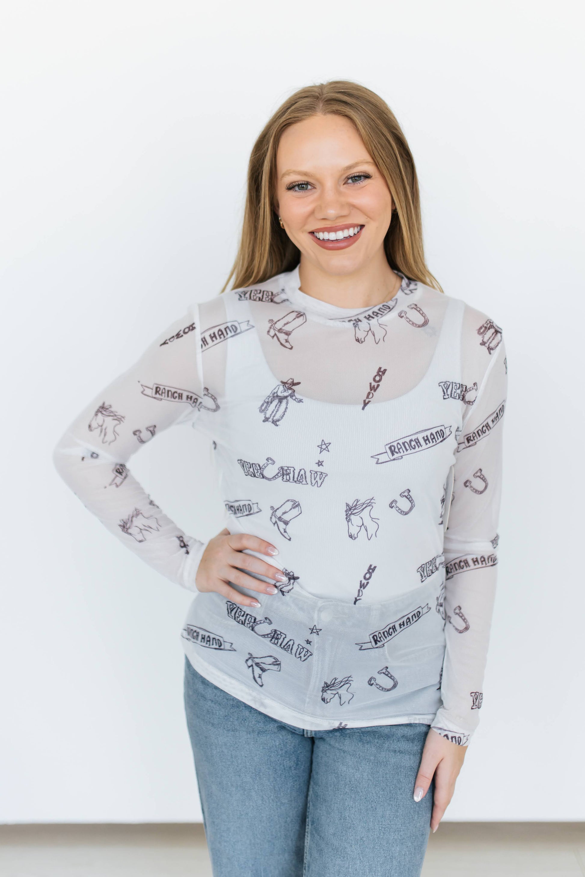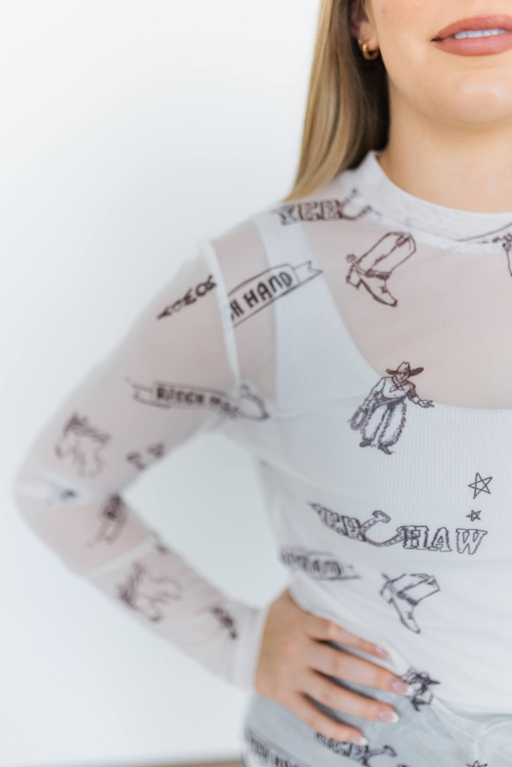 Lightweight long-sleeve mesh top in white, featuring an all-over Western-themed line art print in black. Graphics include cowboy hats, boots, horseshoes, bulls, and text reading “Yeehaw” and “Ranch Hand.” Designed with a crew neckline, slim fit, and straight hem. Semi-sheer stretch mesh makes it ideal for layering over camisoles or under jackets for a Western-inspired statement look.