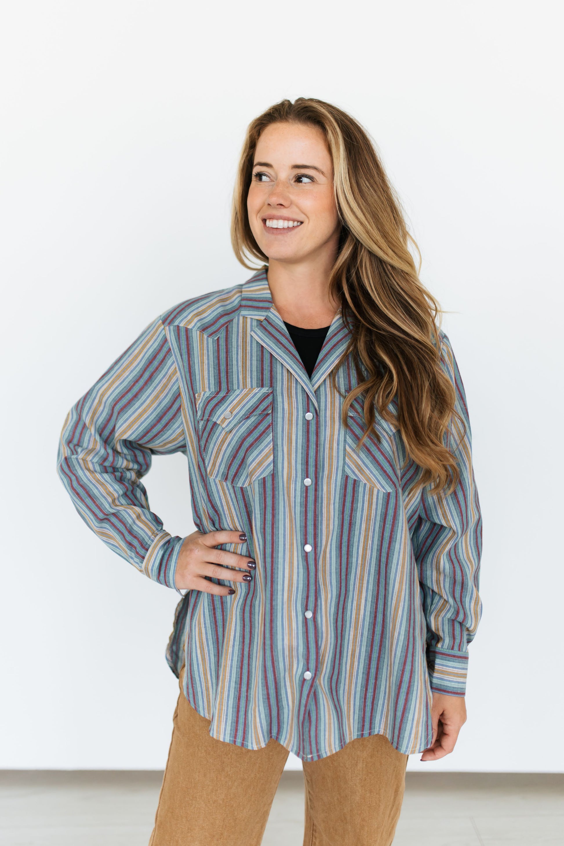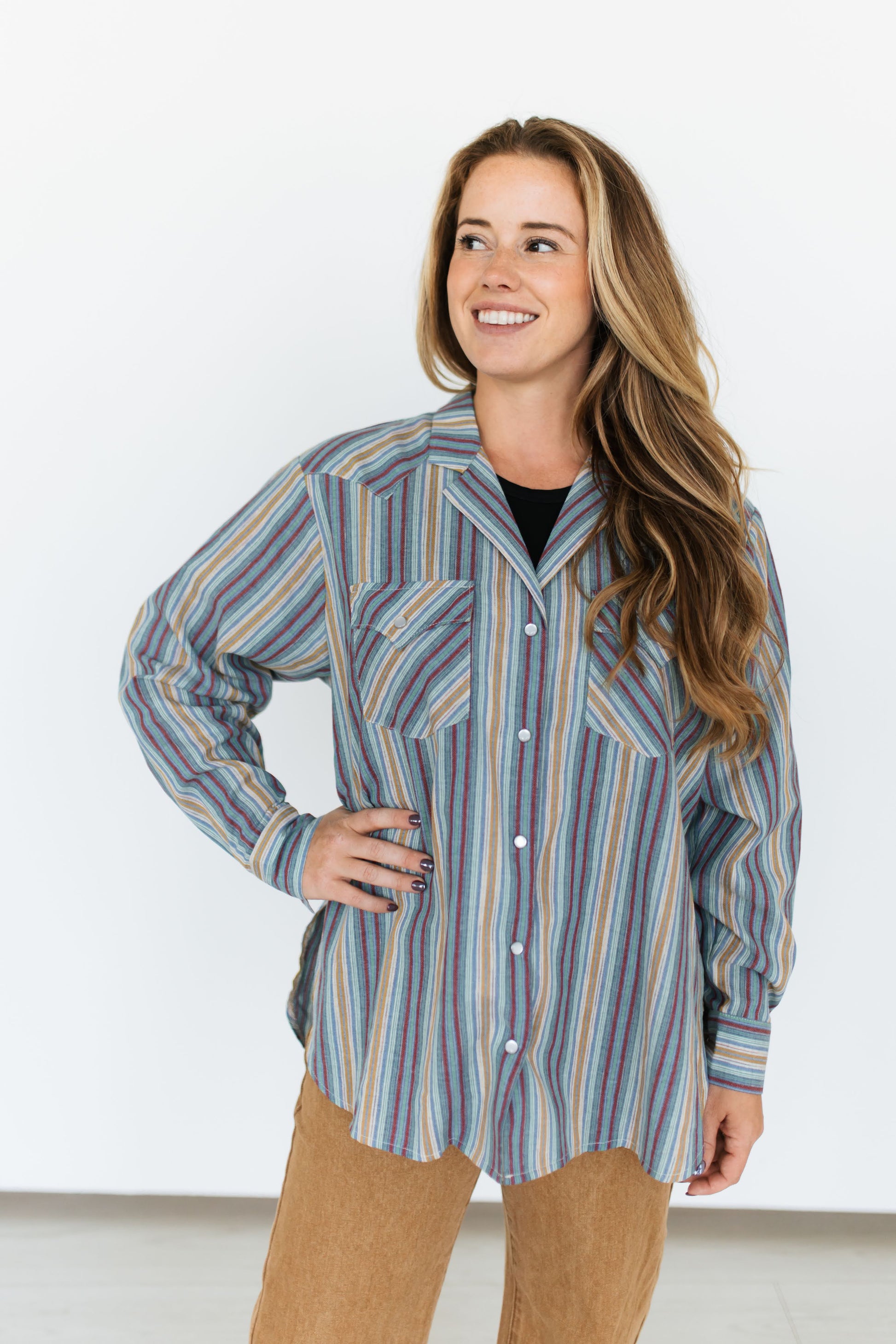 Western-inspired button-down shirt with vertical vintage stripes in blue, plum, mustard, and teal. Designed with a pointed collar, pearl snap front closure, and flap chest pockets with pearl snap details. Features a western yoke on the shoulders and long sleeves with snap cuffs. Relaxed fit for versatile wear.
