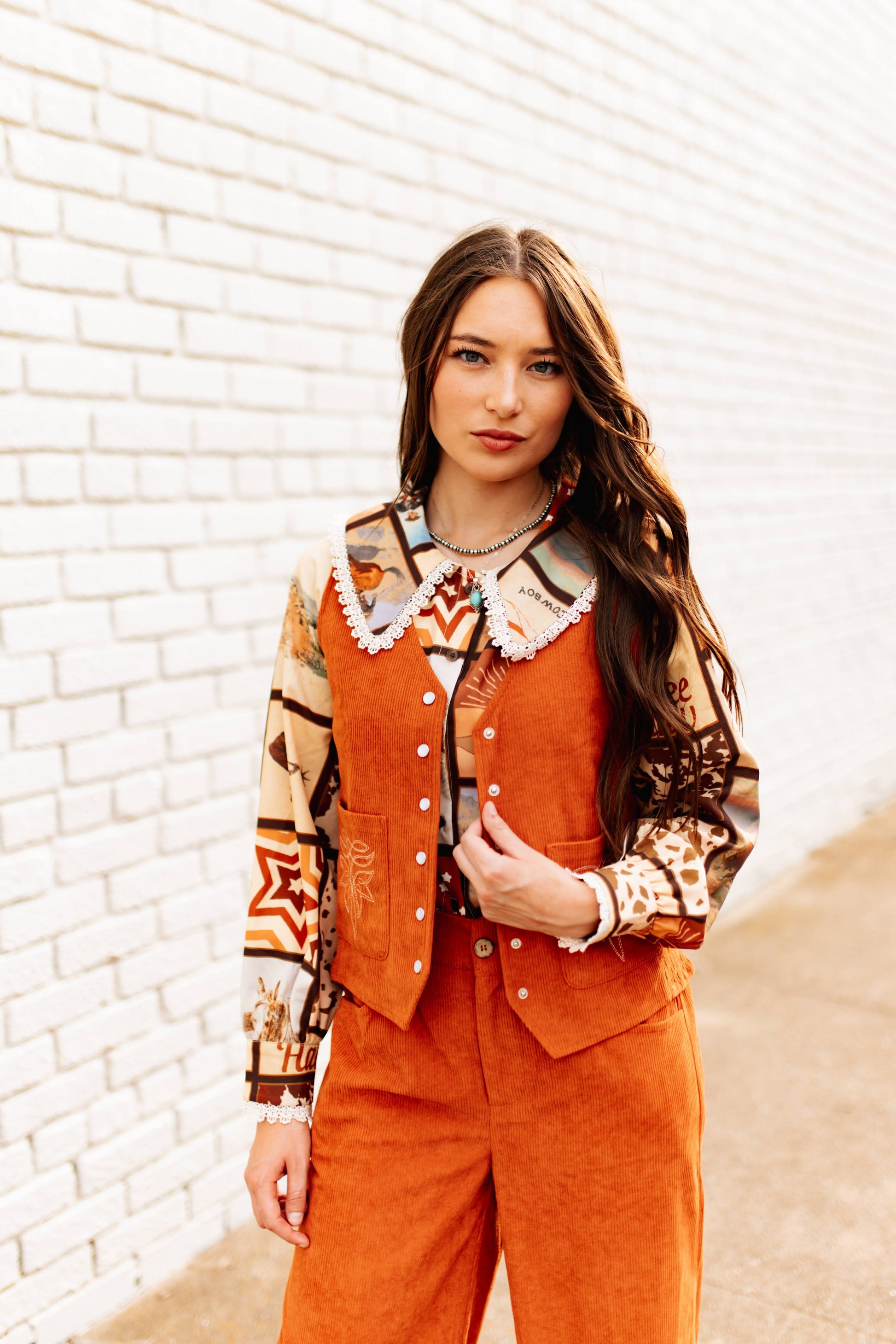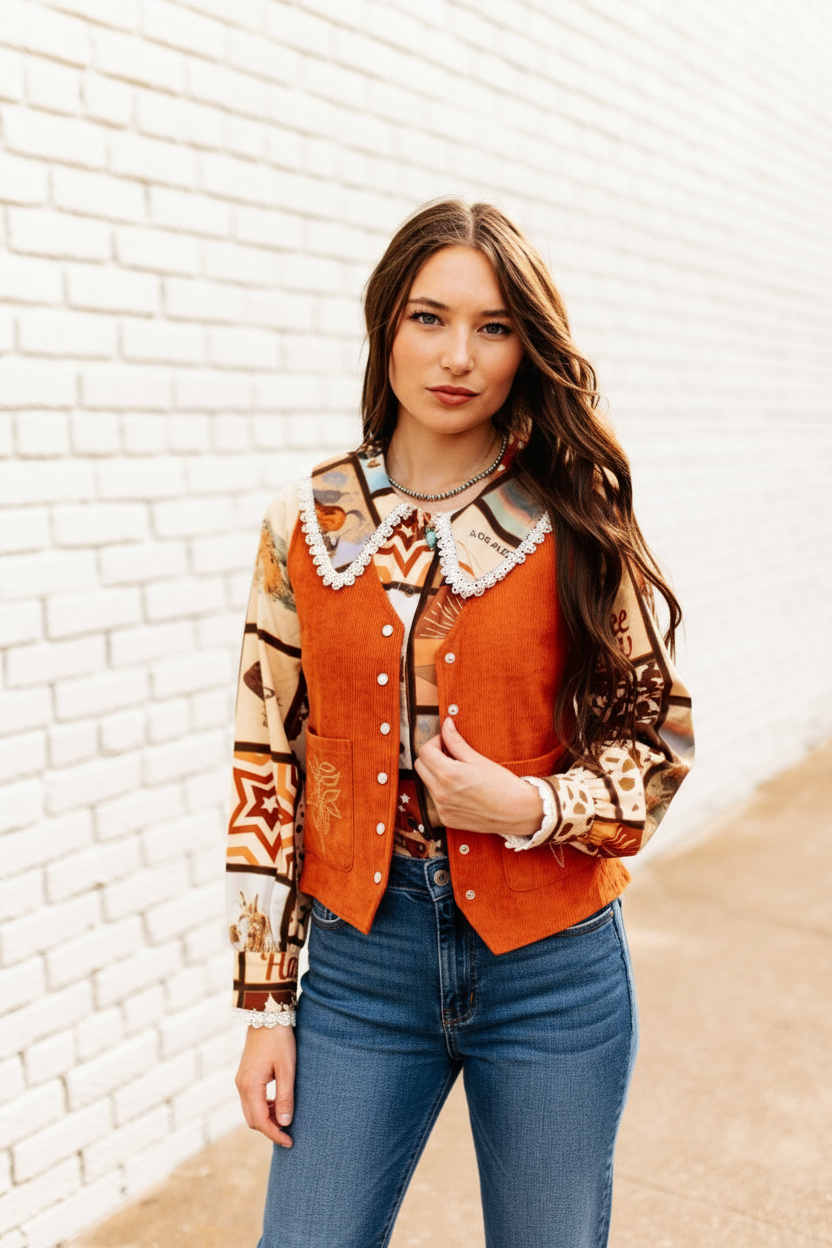 Rust Corduroy Snap Vest with Embroidered Pocket