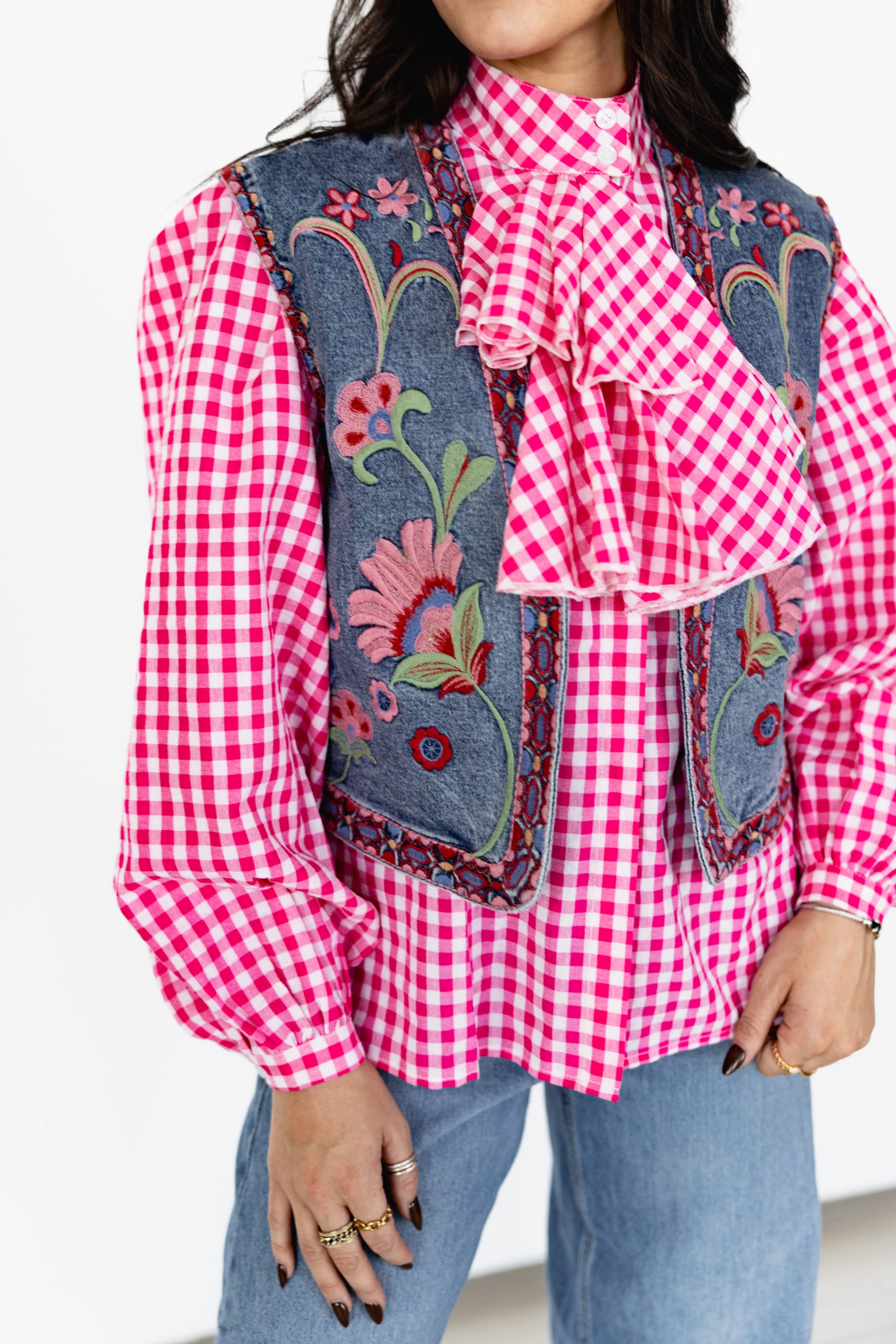 This sleeveless denim vest delivers western-inspired charm with intricate multicolor floral embroidery on a medium-wash base. Designed for layering, it features a structured fit with open front styling, and detailed contrast trim along the edges for added texture and visual interest.