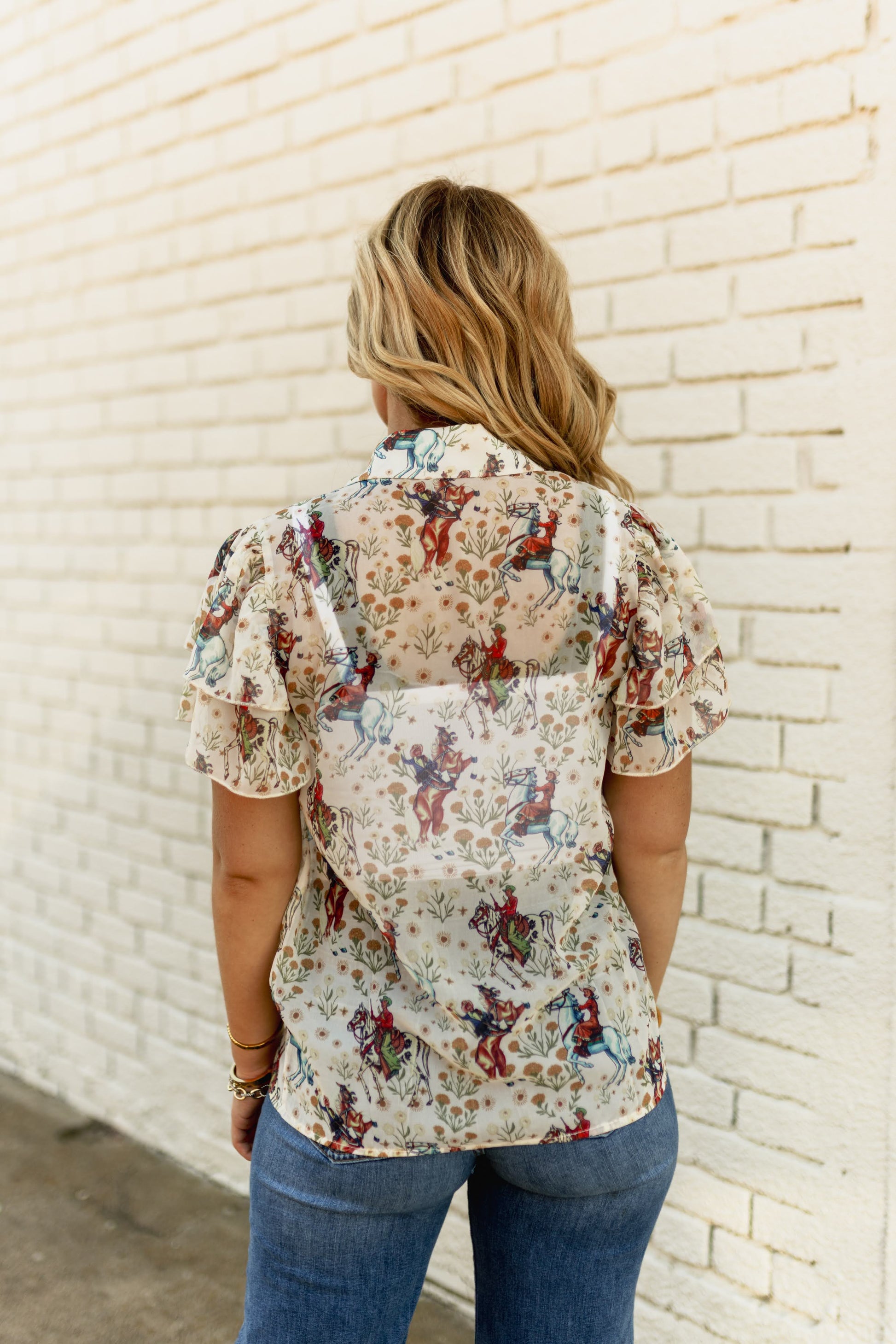This lightweight short-sleeve top features an allover rodeo-themed print with colorful horses and riders set against a soft cream background. It’s styled with a full button front, collared neckline, and tiered ruffle sleeves for added dimension. Crafted from a breathable, semi-sheer woven fabric with a relaxed, flowy fit.