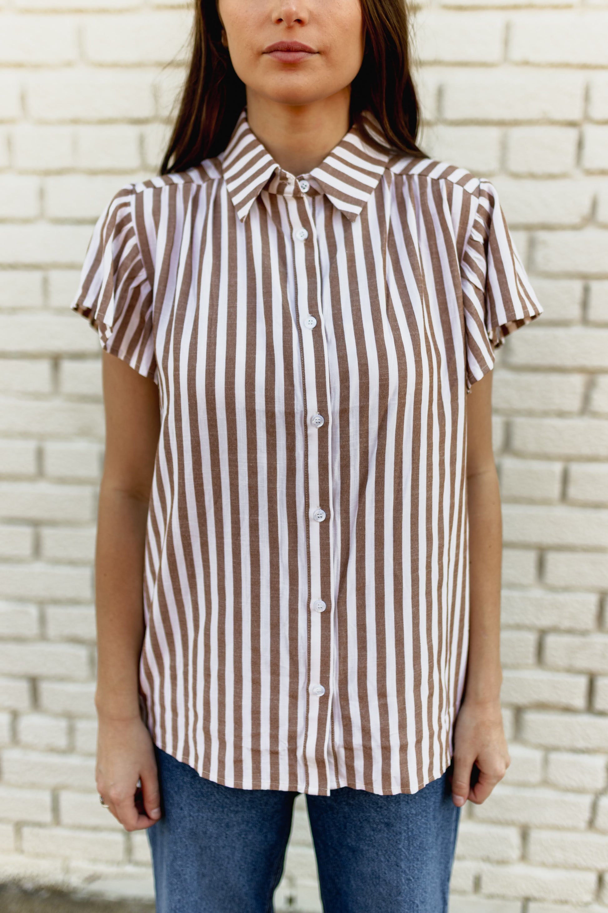 This short sleeve blouse features a vertical brown and white stripe pattern for a clean and tailored look. Designed with a button-down front, collared neckline, and subtle flutter sleeves, it offers a structured yet breathable silhouette that pairs well with denim or trousers.