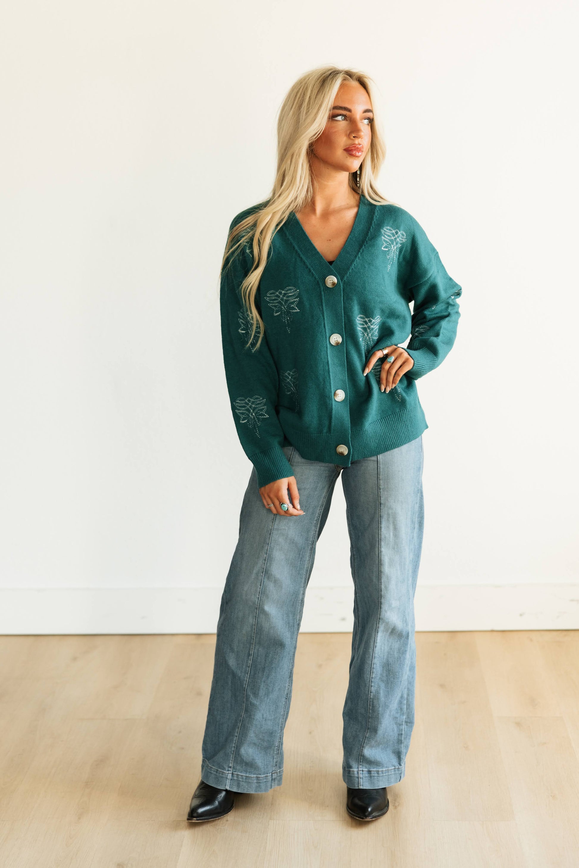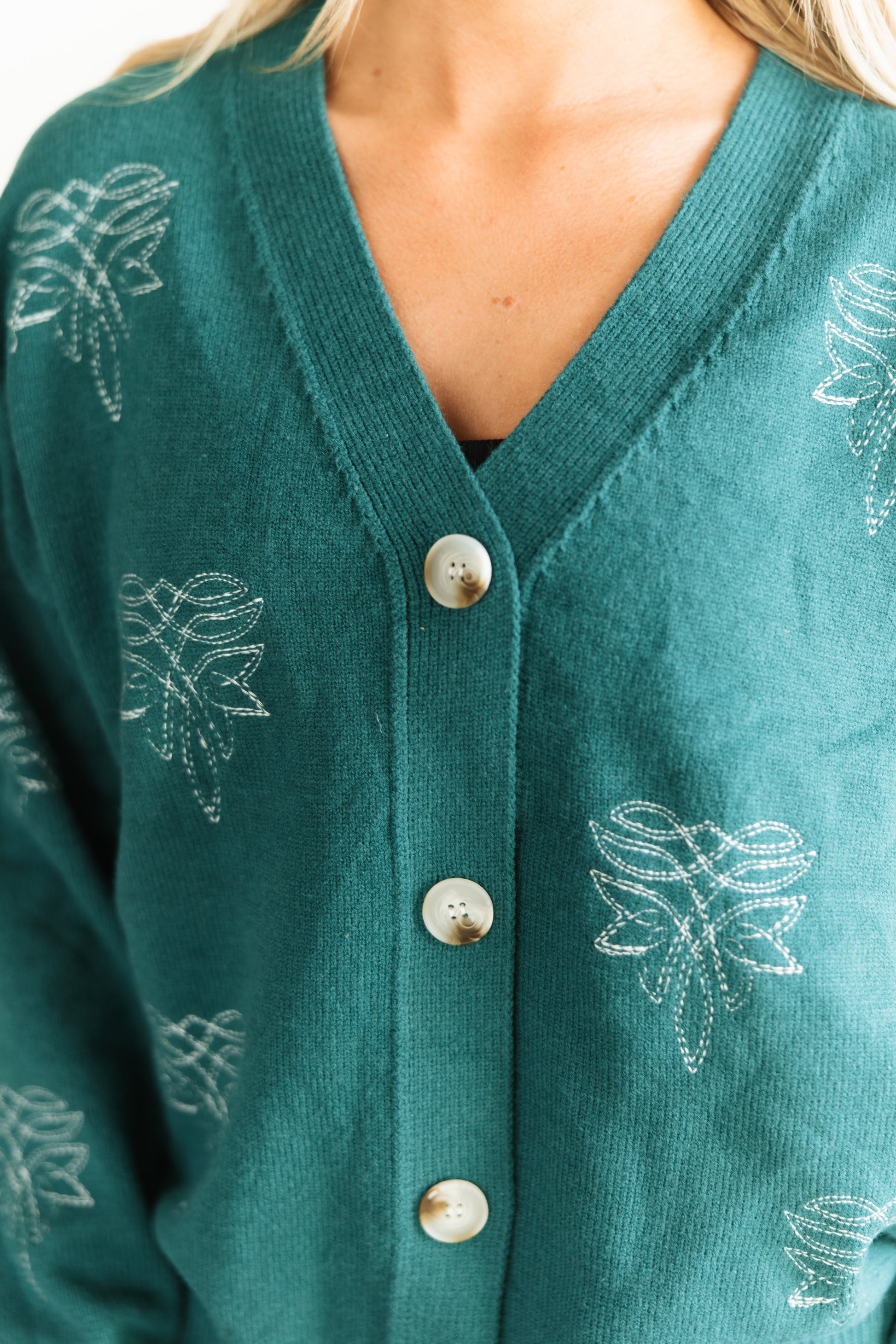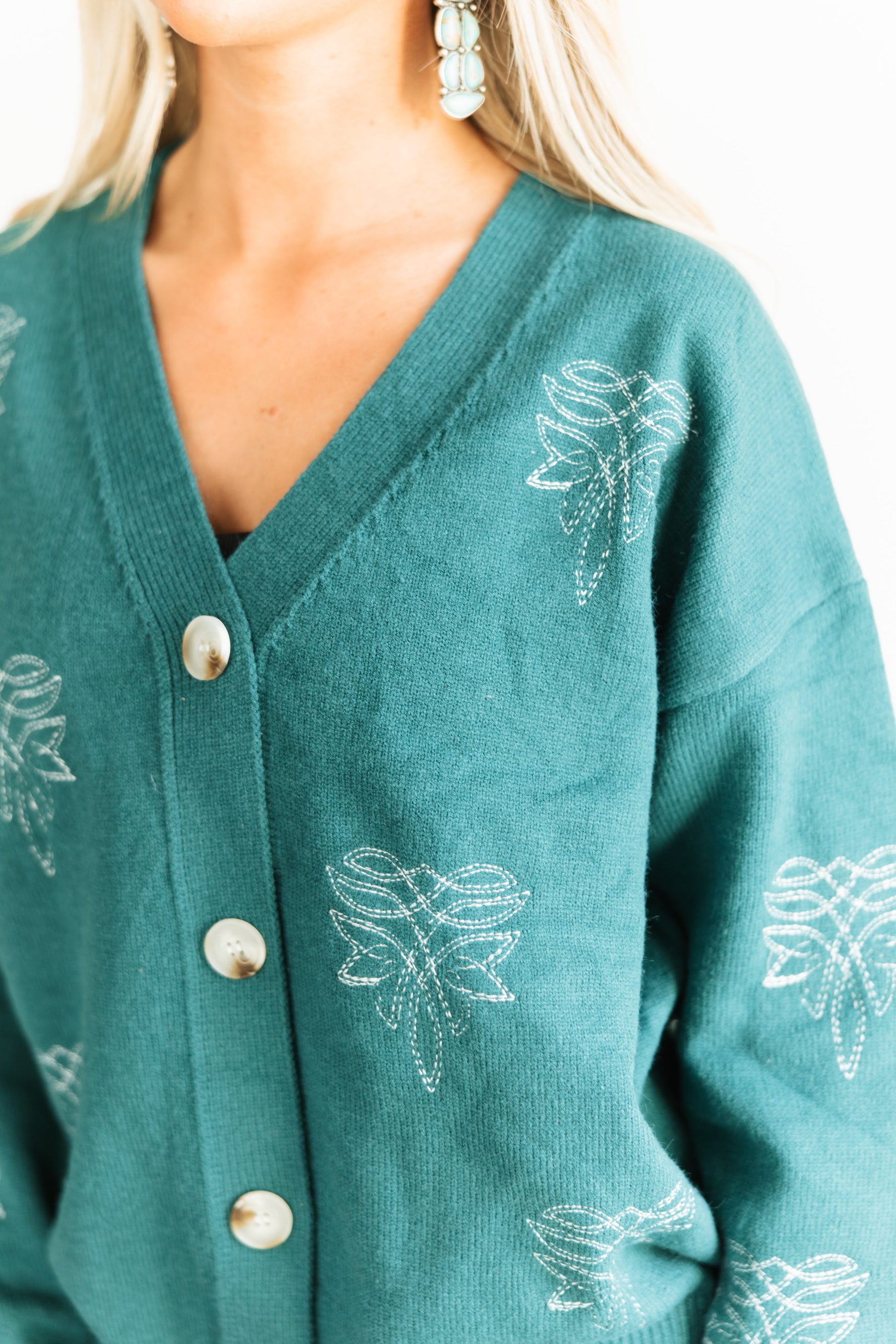 Color/Pattern: Teal base with white embroidered western boot stitch motifs