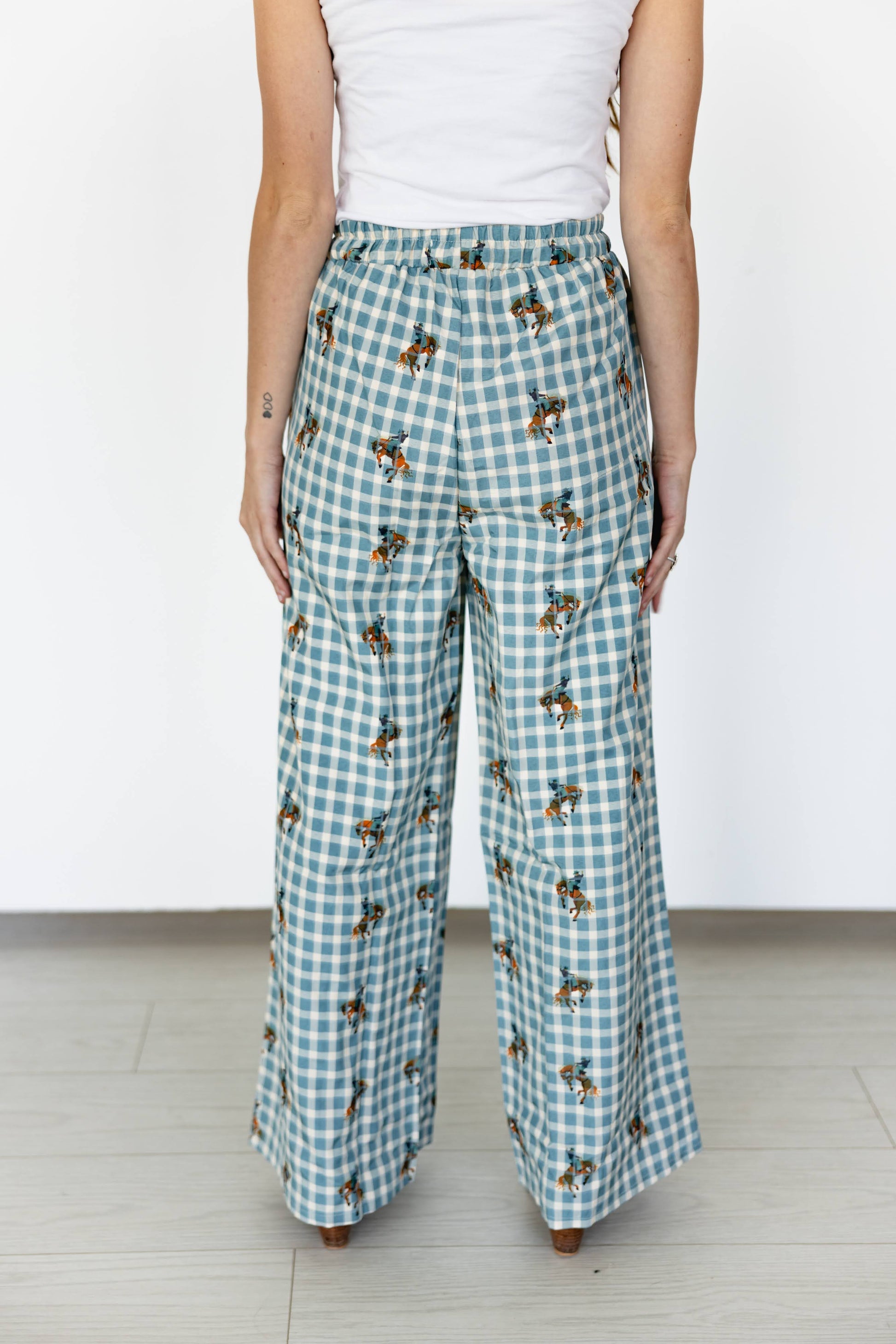 Statement wide-leg pants featuring a light blue and white gingham pattern with an all-over novelty cowboy print. Designed with a relaxed fit through the leg and a comfortable high-rise waist. Soft, lightweight woven fabric offers an easy drape, making them suitable for casual or statement styling.