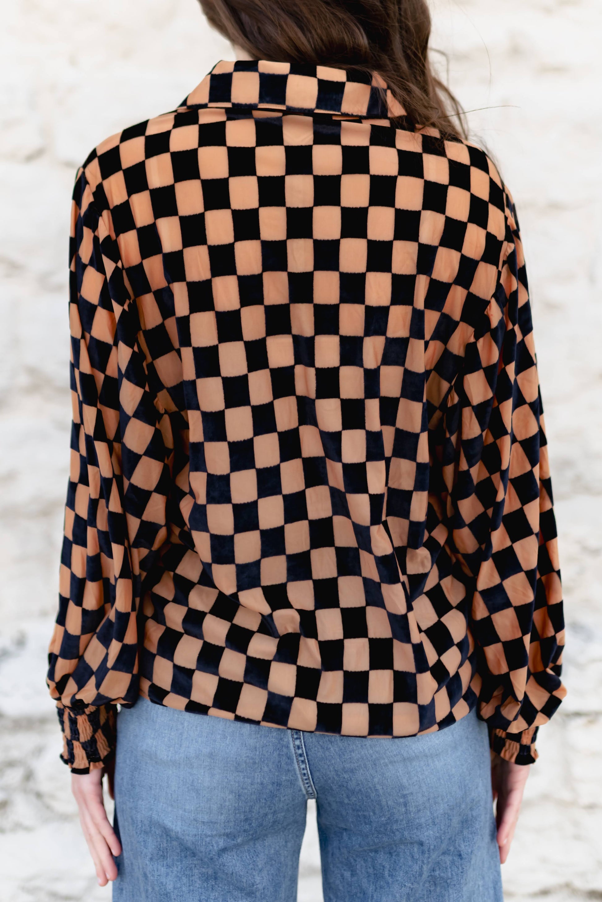 This long sleeve button-down blouse features an eye-catching checkerboard print in contrasting black and warm brown tones. Made from a lightweight woven fabric with a smooth finish, the blouse has a relaxed fit with a traditional shirt collar, full button front, and voluminous balloon sleeves. The sleeves are gathered into wide smocked cuffs, adding texture and shape to the silhouette.