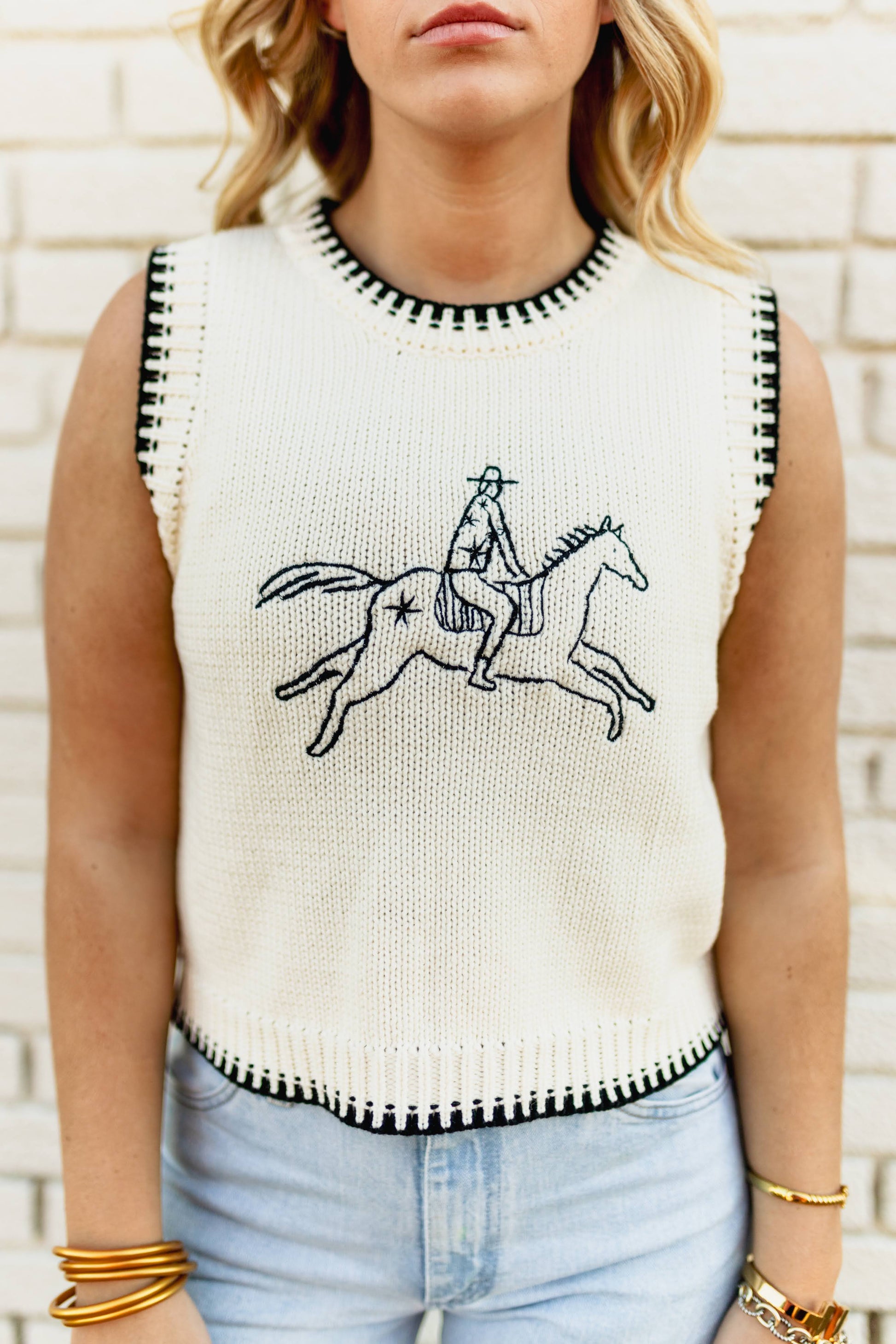 This sleeveless sweater vest features a bold line-art style cowboy and horse graphic embroidered across the front. Crafted in a soft ivory knit, it includes contrast black whipstitch detailing at the armholes, neckline, and hem for added visual interest. The cropped, boxy fit offers easy layering over button-downs or under jackets.