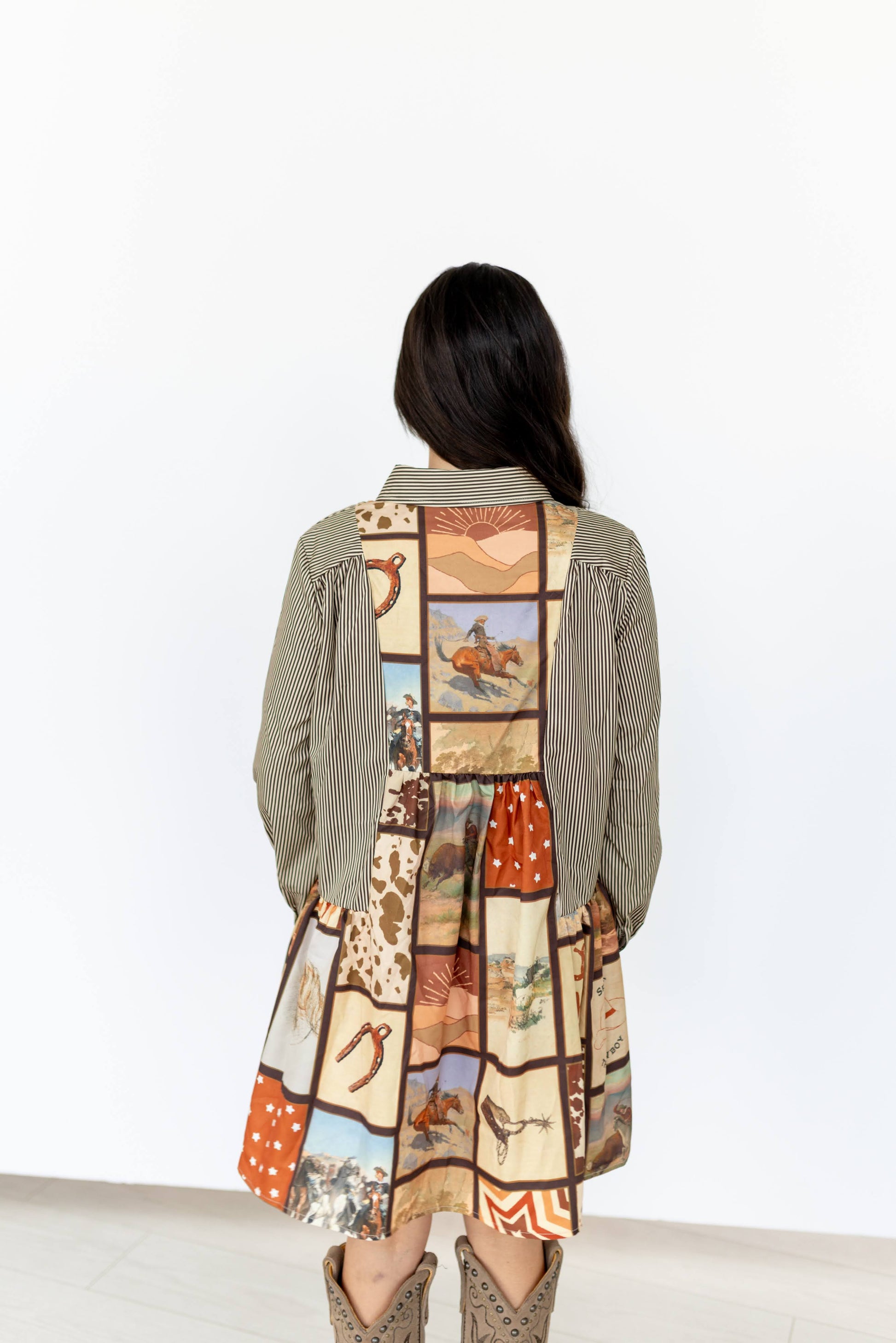 This long sleeve shirt dress features a distinctive western-inspired patchwork design combined with classic pinstripes. The upper portion and sleeves are constructed from a brown and cream vertical stripe fabric, while the lower panel showcases mixed printed square patches with cowboy-themed imagery, stars, and rope graphics. It includes a full button-down front, structured collar, and pleated seam below the bust for added volume and movement. Ideal as a statement piece for western or vintage-themed boutique collections.