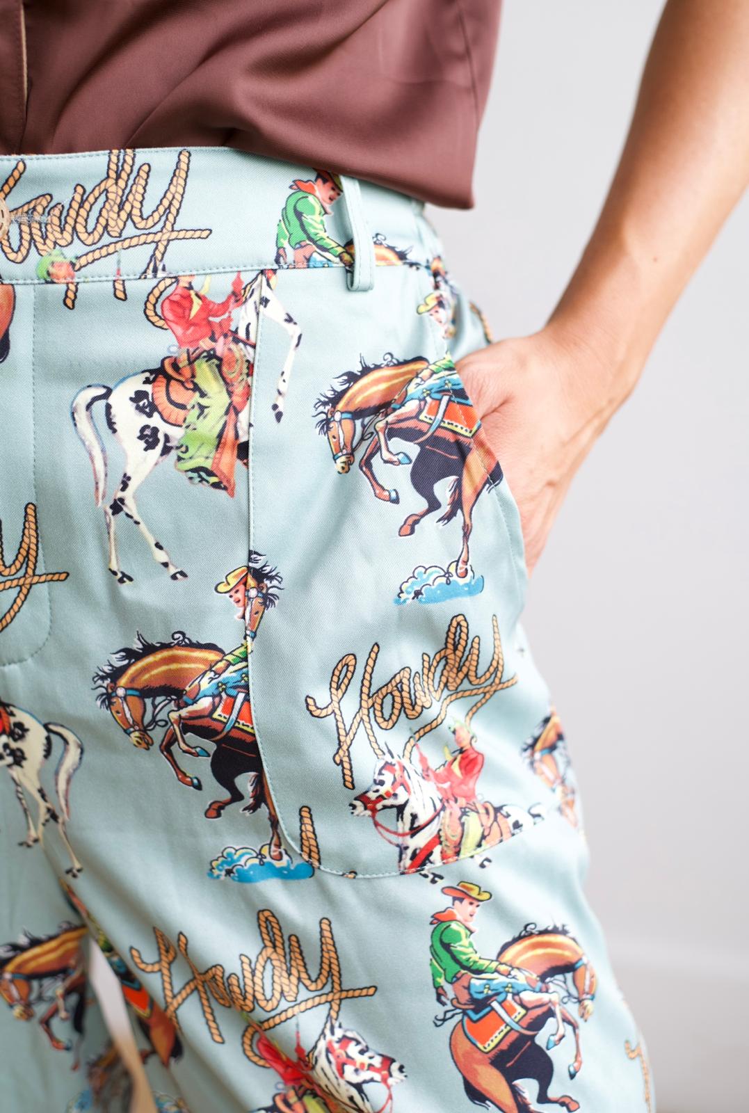 These wide-leg statement pants feature an allover Western-themed novelty print on a teal background, including rodeo cowboys, broncos, and “Howdy” text illustrations in vibrant colors. Designed with a high-rise waist and full-length leg, the pants offer a relaxed silhouette perfect for standout seasonal styling. A front zipper with button closure ensures secure wear, while side pockets add functional convenience.