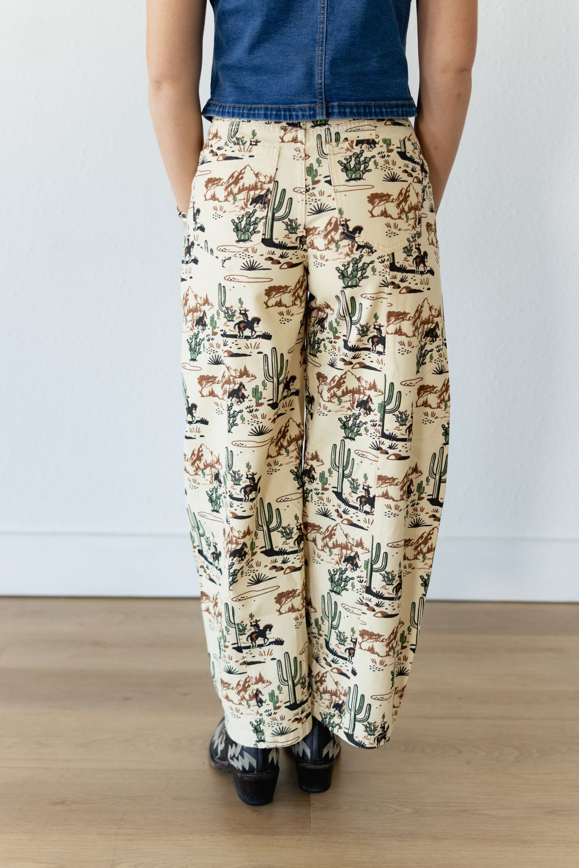 The Cowboy cactus wide leg jean delivers bold personality and everyday structure. These high-waisted trousers are cut from sturdy canvas in a cream base, featuring a coordinated allover print of western desert scenes with cowboys, horses, and cacti. The pants offer a full-length wide leg, classic button-and-zip front closure, and belt loops.