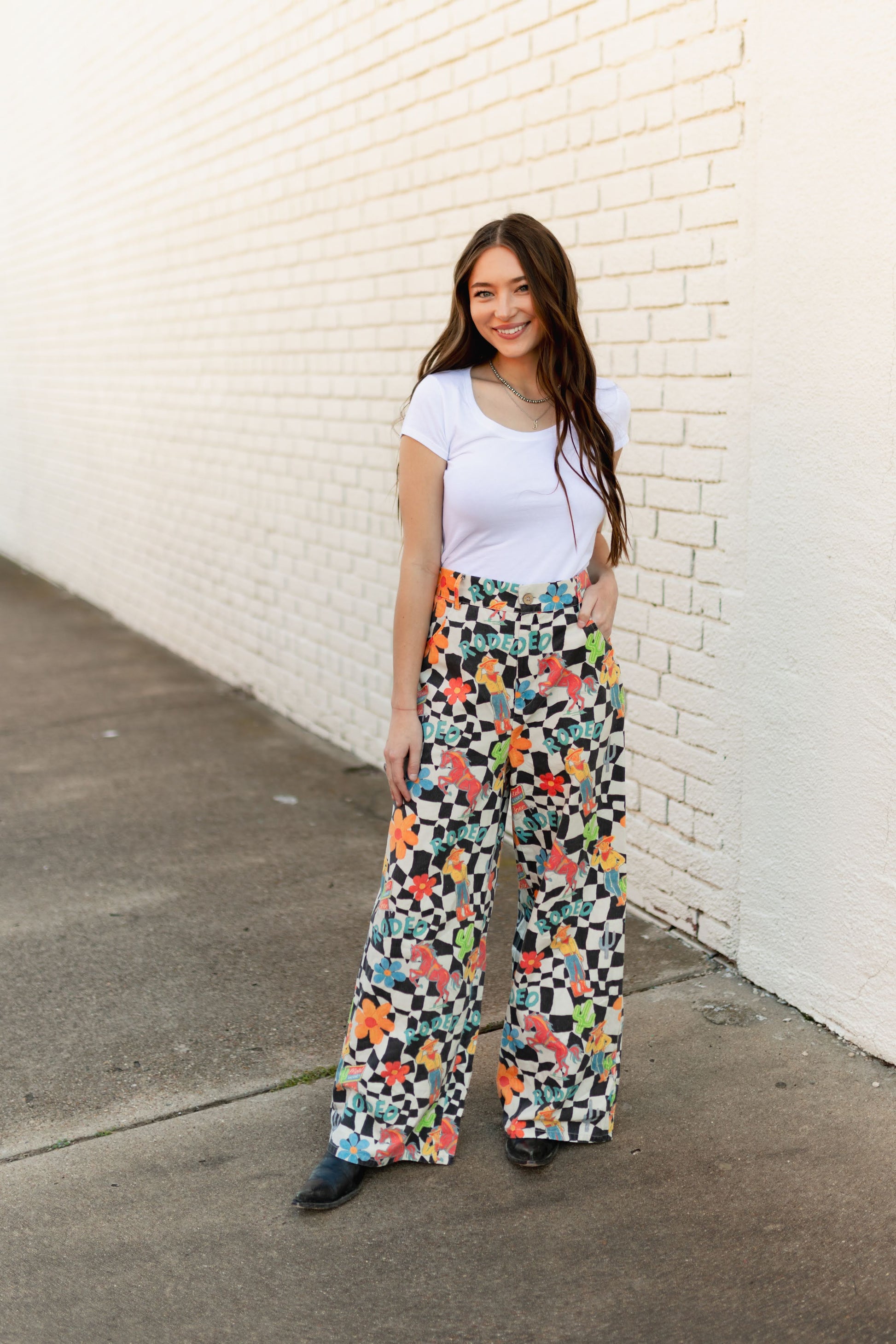 These high-rise, wide-leg pants feature a bold rodeo-themed allover print with cowboys, horses, cacti, and florals against a black-and-white checkered background. Made from a medium-weight woven fabric, they include a structured waistband with belt loops, a front button and zip closure, and side pockets for functionality. The pants offer a relaxed fit through the leg, ideal for casual boutique collections or statement Western-inspired drops.