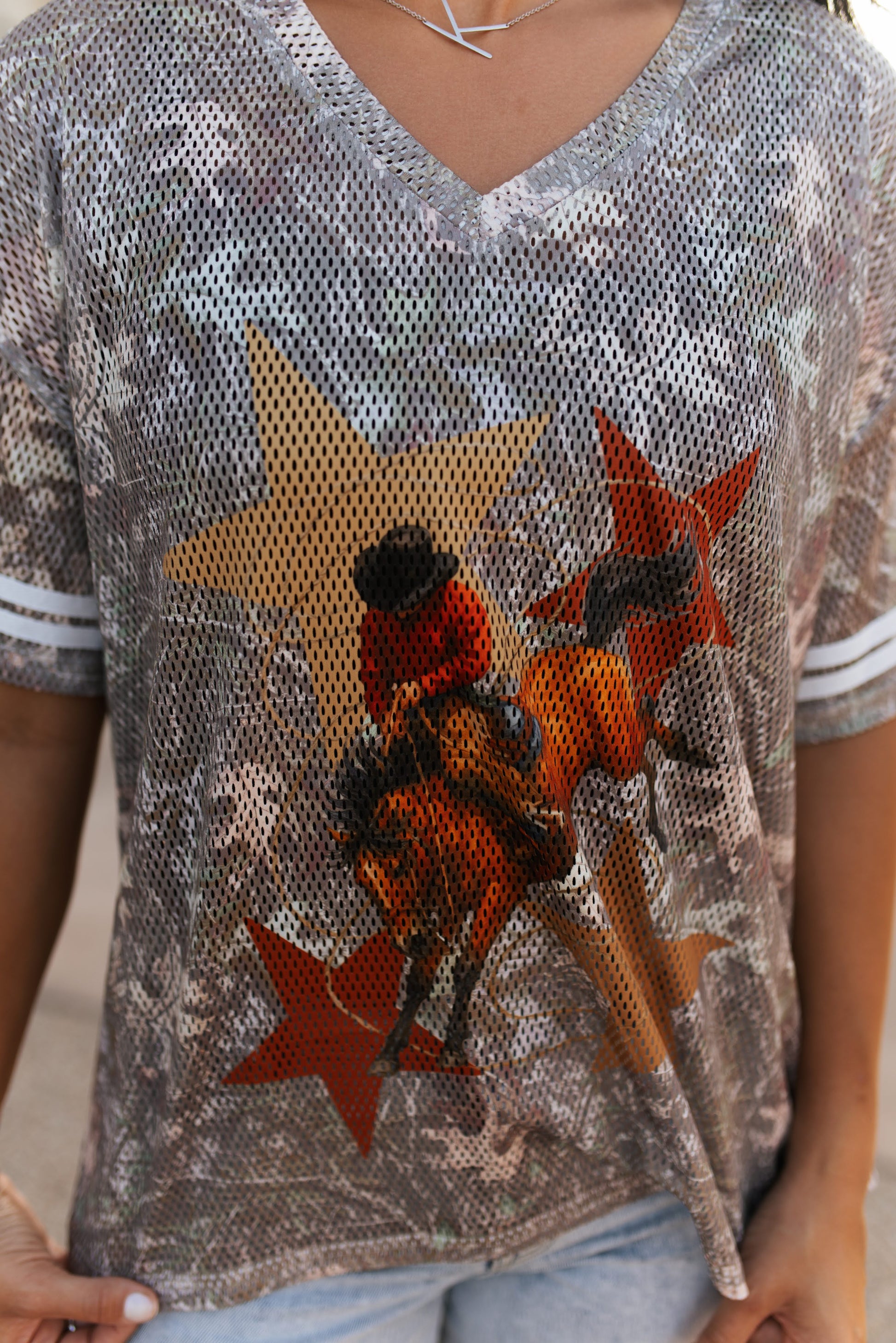 This mesh V-neck tee features a relaxed, oversized fit with short sleeves and striped athletic accents at the cuffs. The lightweight fabric has a muted, mixed-tone pattern with a bold rodeo graphic and star motifs across the front. Its breathable construction and easy silhouette make it suitable for casual layering or warm-weather wear.