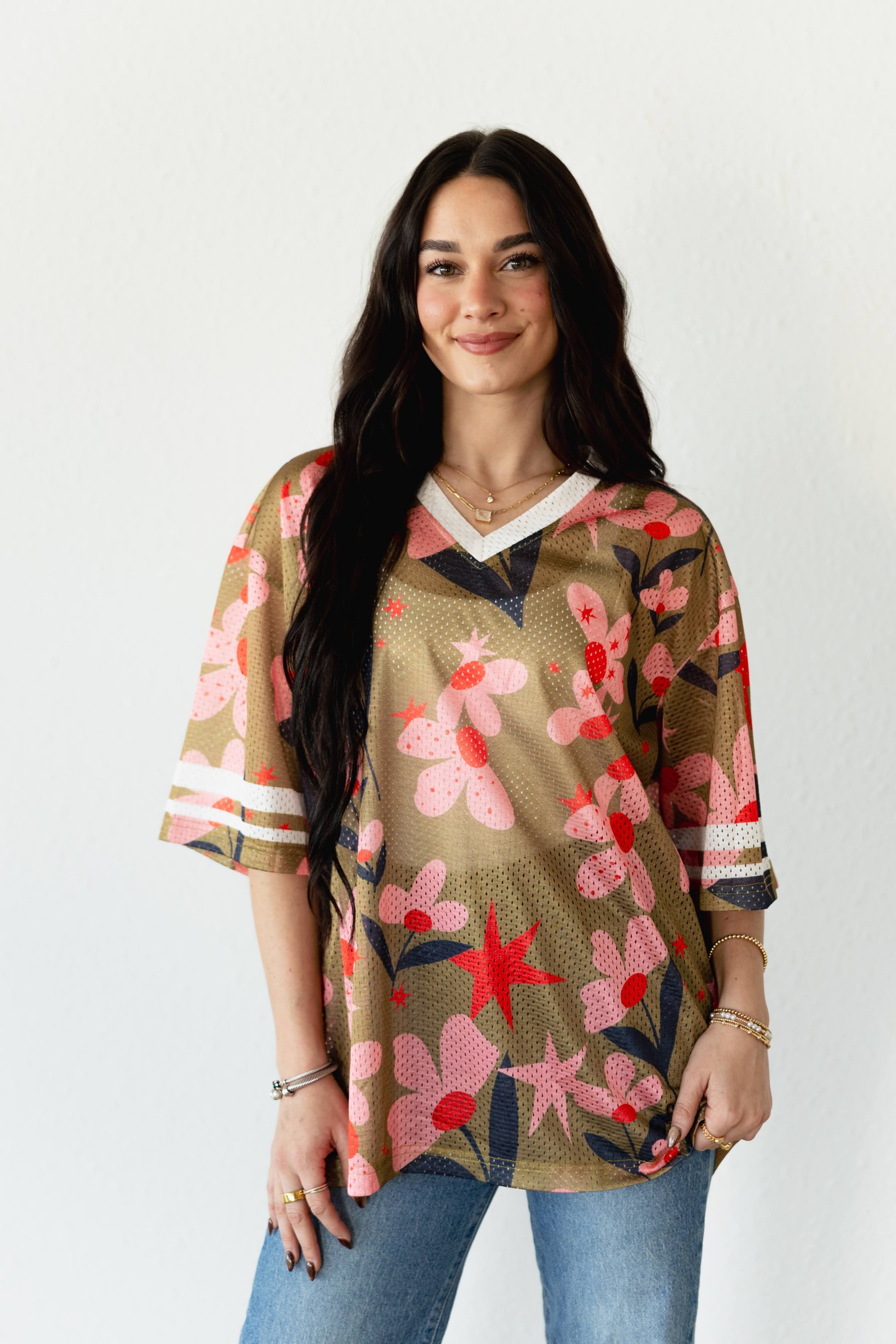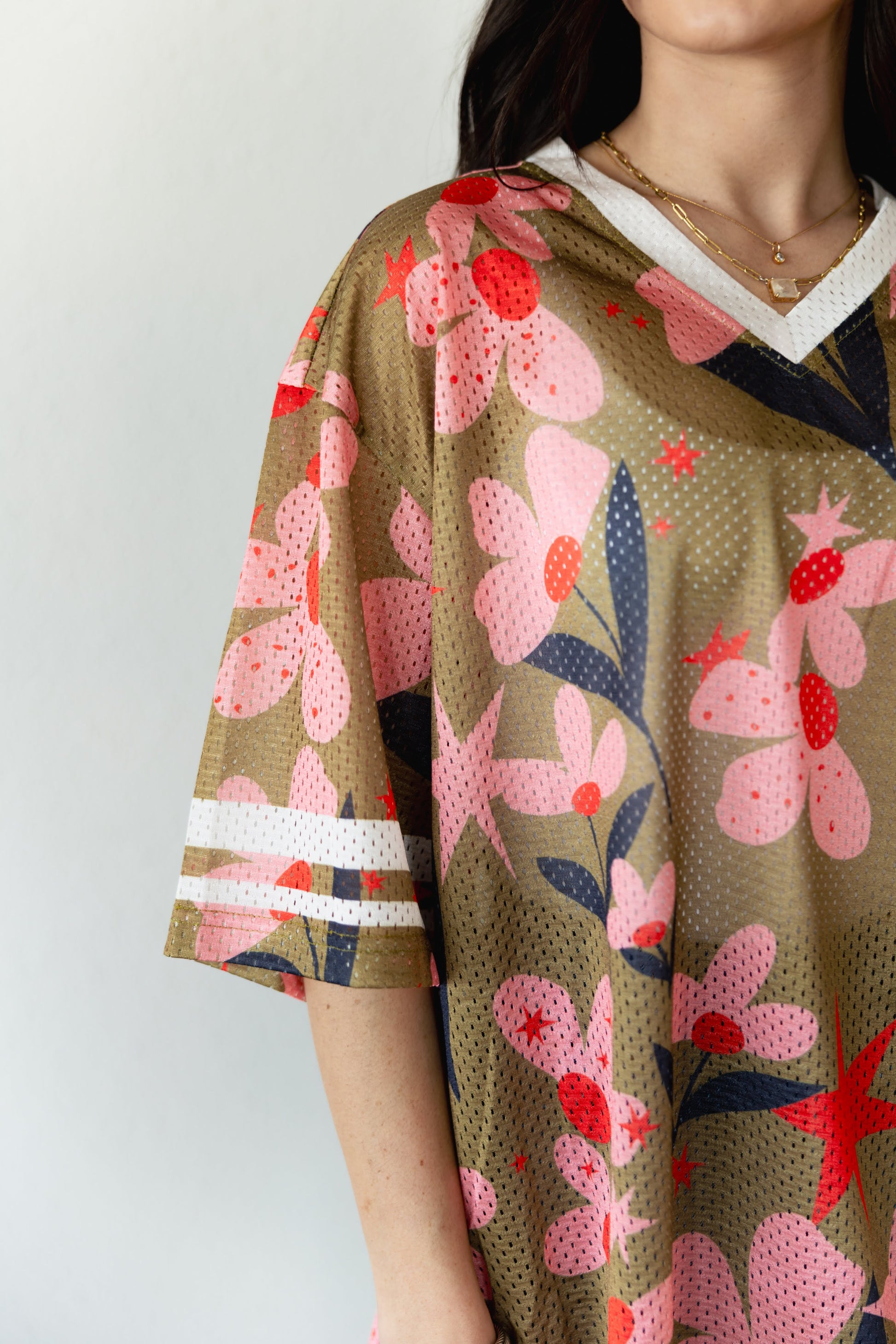 This relaxed-fit mesh jersey top features an all-over floral print in shades of pink, red, and navy on an olive-green base. The breathable perforated fabric provides a lightweight and sporty feel, ideal for layering or wearing solo. Designed with a white V-neckline and matching striped sleeve cuffs, it merges athletic inspiration with a playful botanical pattern. The top has elbow-length sleeves and a straight hem.
