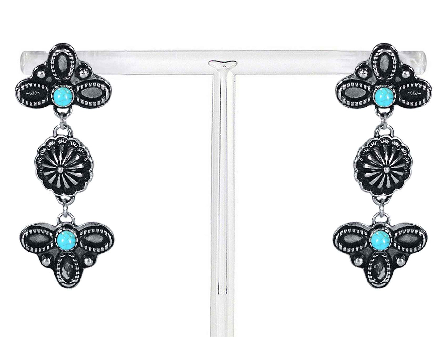These three-tier dangle earrings showcase Western-inspired motifs with stitched detailing and floral accents. The design features a top and bottom panel resembling decorative boot stitching, each set with a round turquoise-colored cabochon. A concho-style floral medallion connects the two segments for added movement and texture.