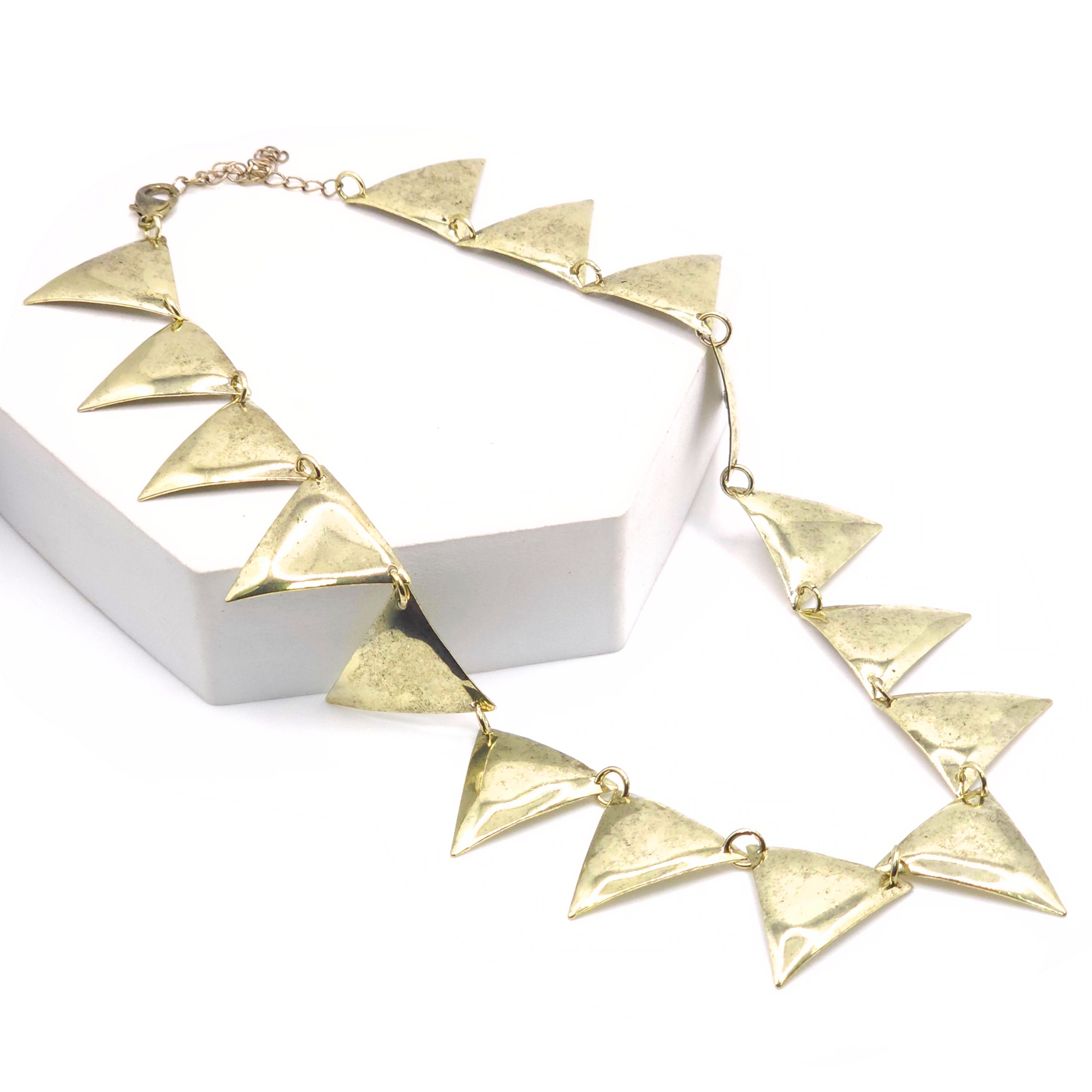 Make a bold statement with this Antique Gold-Tone Geometric Triangle Necklace, a striking addition to any boutique collection. Featuring a series of linked, hammered triangle pendants, this necklace blends modern geometric design with vintage-inspired charm. The antique gold-tone finish adds a touch of rustic elegance, while the adjustable chain ensures a comfortable, customizable fit.